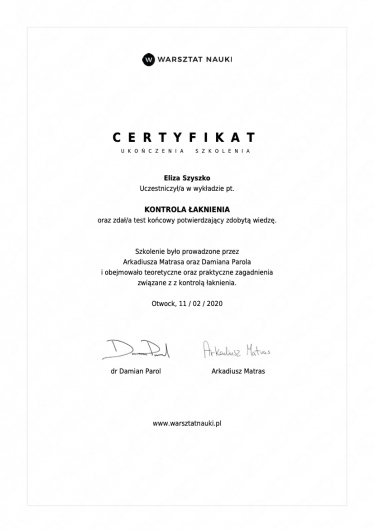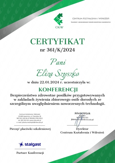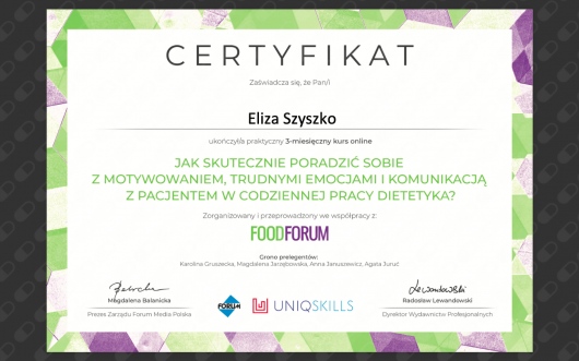 - 01.2020 - Dietetyk kliniczny w Wojewódzkim Szpitalu im. Św. Ojca Pio w Przemyślu, Oddział Ginekologii i Położnictwa