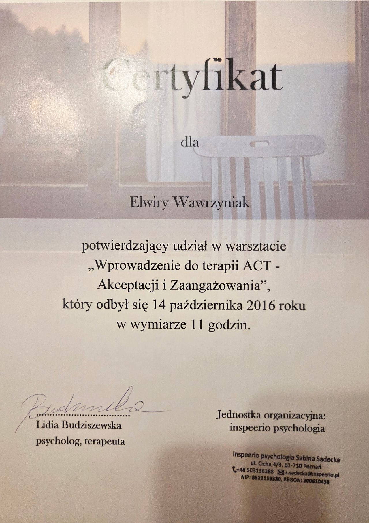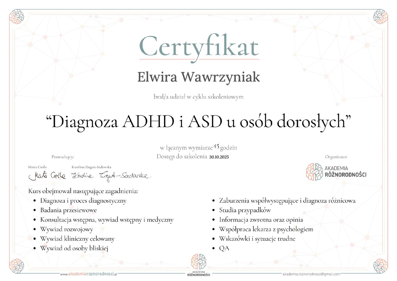 Jaki jest zakres porad oferowanych przez Elwira Wawrzyniak?Elwira Wawrzyniak to psycholog. Na podstawie swojego doświadczenia i wykształcenia Elwira Wawrzyniak oferuje usługi takie jak: Konsultacja psychologiczna, psychoedukacja, konsultacja psychologiczna (kolejna wizyta), poradnictwo psychologiczne, psychoterapia indywidualna, konsultacja psychologiczna (pierwsza wizyta), diagnoza ADHD dla dorosłych, Konsultacja psychologiczna online.