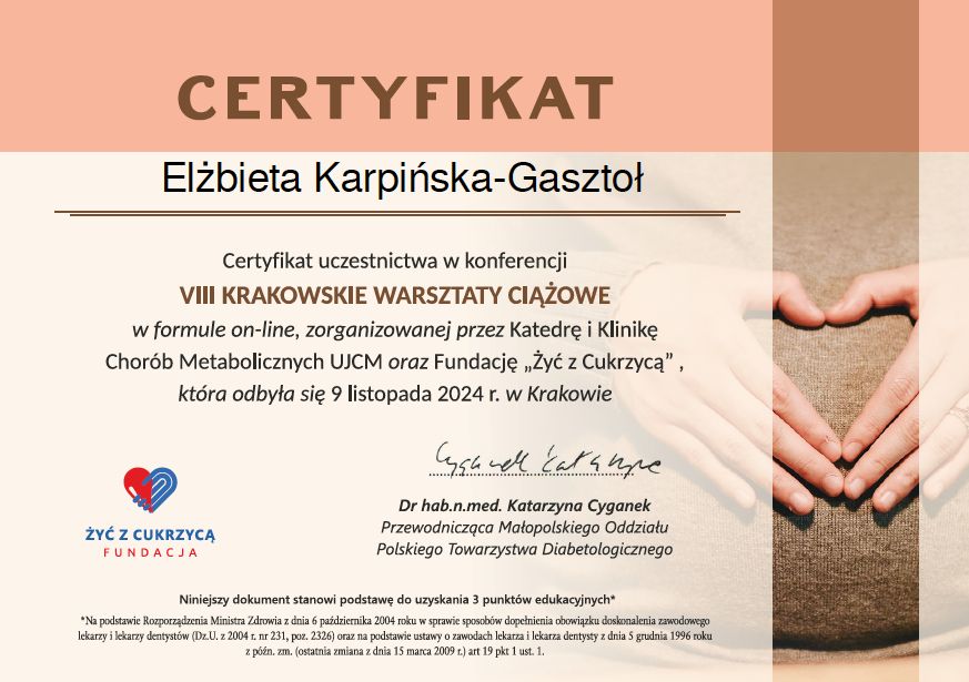 Specjalizacja w dziedzinie endokrynologii uzyskana w 2011 roku.