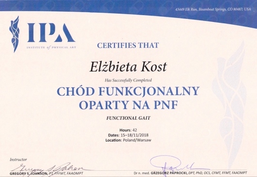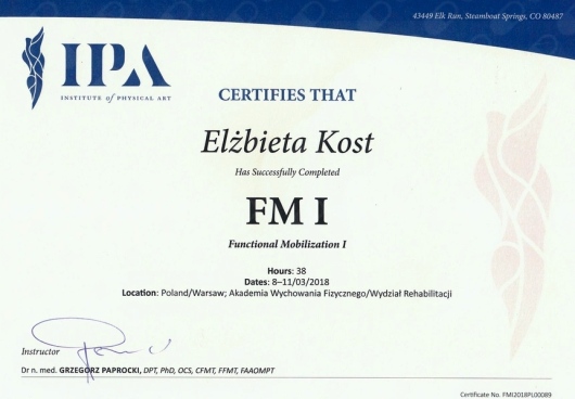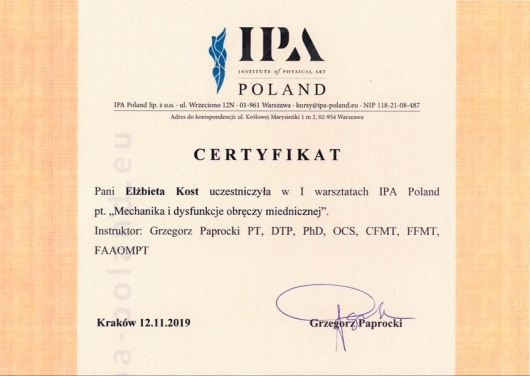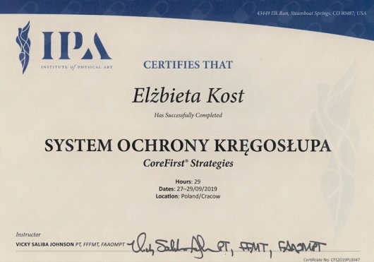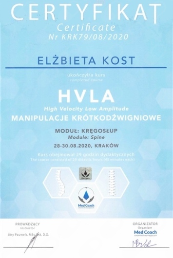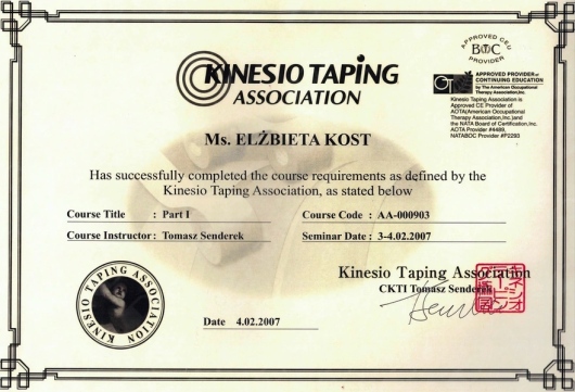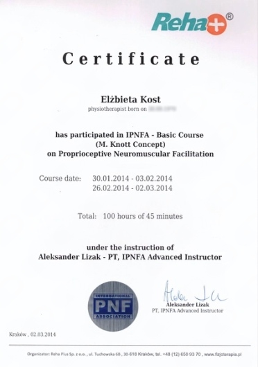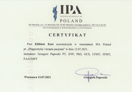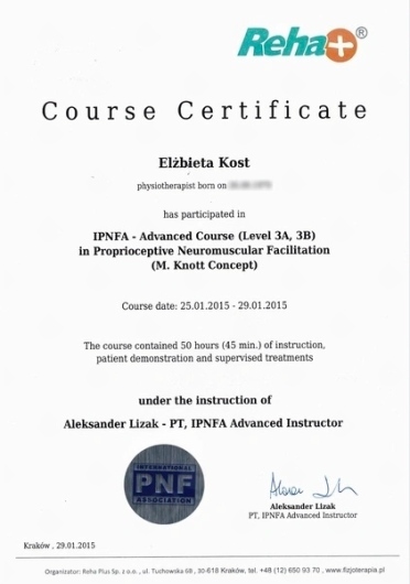 Dodatkowo jestem dyplomowaną terapeutką metody McKenziego i metody PNF oraz posiadam uprawnienia instruktora sportu w zakresie kulturystyki. Zajmuję się rehabilitacją sportowców, oferując wsparcie w powrocie do pełnej sprawności po kontuzjach czy urazach.