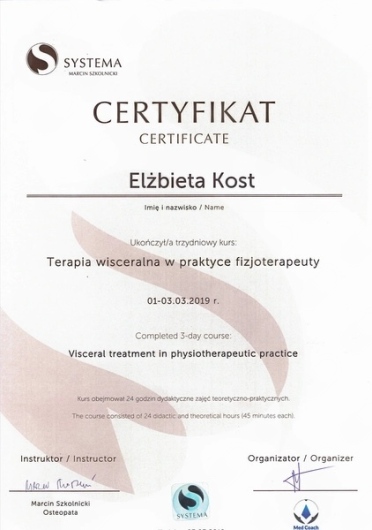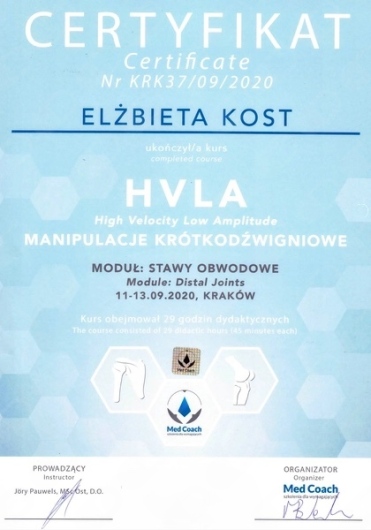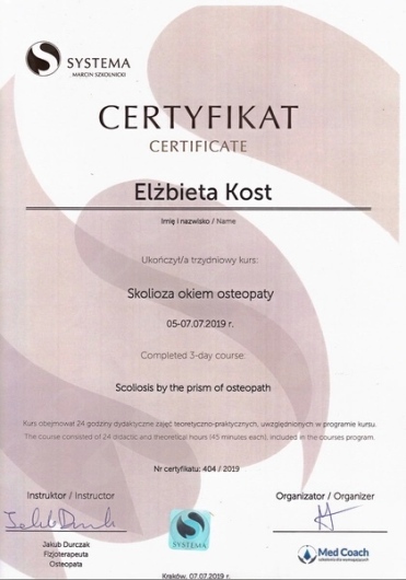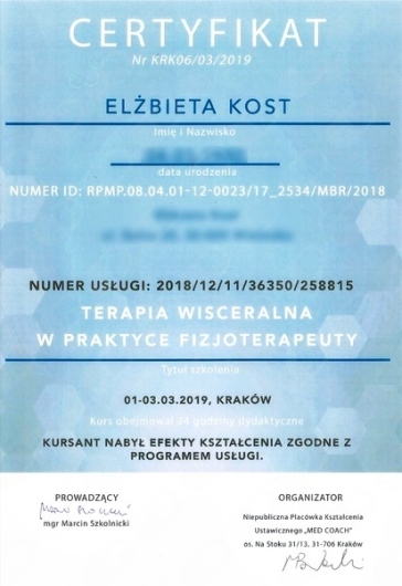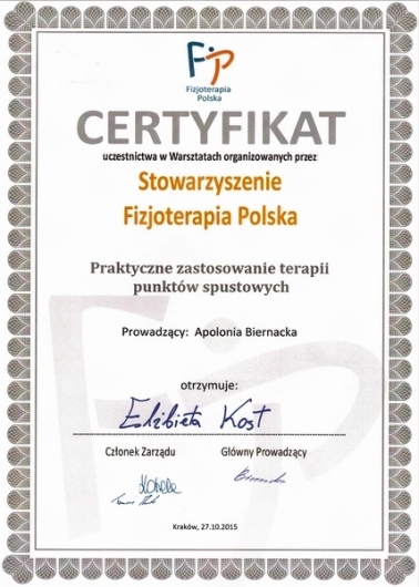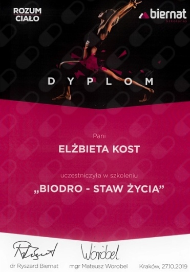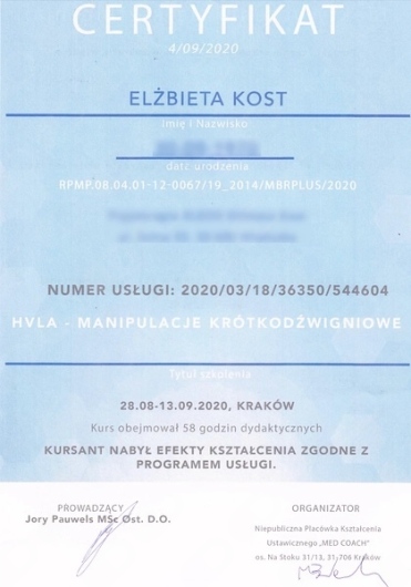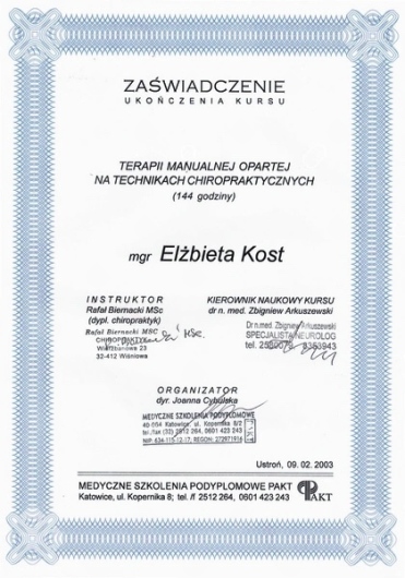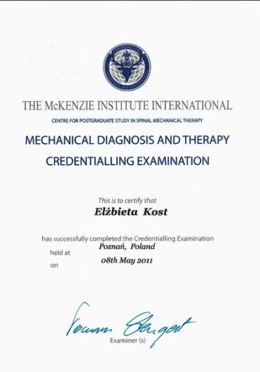 • Fizjoterapeuta z powołania i pasji - Magister Fizjoterapii oraz Specjalista Rehabilitacji Ruchowej, absolwentka Akademii Wychowania Fizycznego w Krakowie. Bogate doświadczenie oraz szerokie kwalifikacje fizjoterapeutyczne zdobyłam w trakcie wieloletniej pracy z pacjentami, którzy zmagali się z wieloma różnymi schorzeniami, dolegliwościami i chorobami. Ukończyłam szereg zaawansowanych kursów doszkalających, które umożliwiają mi ciągły rozwój zawodowy i wdrażanie najnowszych, efektywnych metod w pracy z pacjentami.