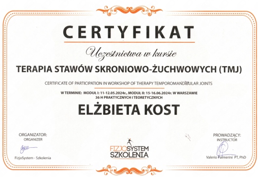 Moje metody terapeutyczne obejmują także relaksację mięśni i stawów, co wspomaga procesy regeneracji i poprawia ogólne samopoczucie. Posiadam także szerokie umiejętności i wiedzę z zakresu rehabilitacji (w tym rehabilitacja ortopedyczna, rehabilitacji pooperacyjna, rehabilitacji pourazowa, rehabilitacja i fizjoterapia stomatologiczna stawów skroniowo-żuchwowych, rehabilitacja sportowców).