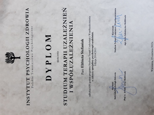 Doświadczenie zdobywałam pracując 4 lata na Oddziale Psychiatrii Sądowej o wzmocnionym zabezpieczeniu, 5 lat na tzw Oddziale Leczenia Podwójnych Diagnoz oraz stażach i kursach.