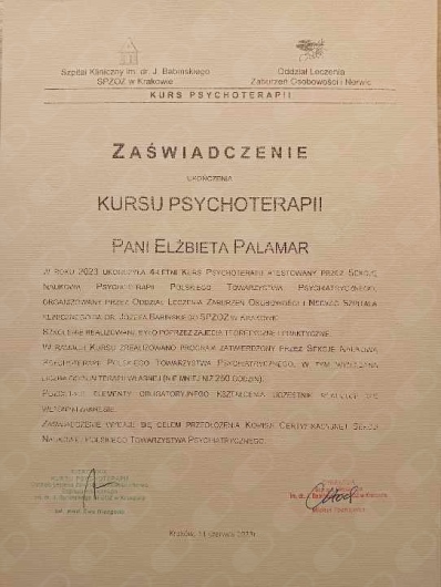 Niedawno po ponad 3 latach zakończyłam terapię i jestem wdzięczna, że trafiłam na Panią Elżbietę. Na terapii udało mi się przepracować problemy, z którym zmagałam się przez lata. Pani Elżbieta jest bardzo empatyczna, nie ocenia i daje dużo przestrzeni na nasze emocje. Zadaje wnikliwe pytania, które kierują nas w różne refleksje i pytania, których sami sobie byśmy nie zadali albo nigdy nie znaleźli odpowiedzi. Na prawdę z czystym sumieniem polecam, jeśli ktoś się zmaga z problemami i chce w końcu zacząć oddychać i żyć.