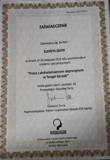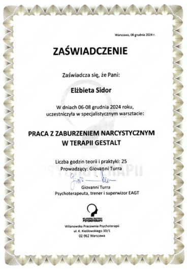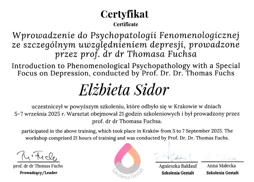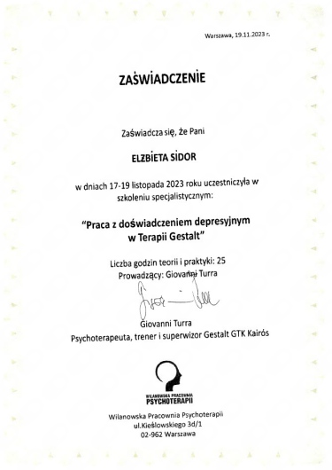 Uczęszczam od maja 24r na terapię do Profesjonalistki Pani Eli. Na początku 3 spotkania zapoznanie i decyzja czy złapiemy wspólny vibe i czy kierunek terapi Gestalt z początku w ogóle nie wiedziałem uczęszczając na spotkania czy to dla mnie uczęszczałem z powodu mocnego dołka co tydzień systematycznie i po okresie ok dopiero 2 miesięcy ja sam zacząłem zauważać mocna wiez i wstępne postępy pracy która wykonujemy i rozdrabniamy często na czynniki pierwsze, gdzie do tej pory nie otworzyłem emocjonalnie sie Nigdy przed nikim nawet żoną z nie raz bardzo ciężkimi traumatycznymi wspomnieniami z dzieciństwa i z obecnego rowniez czasu dnia codziennego. Ela pomogła i pomaga mi w dalszym ciagu odnaleźć odpowiedzi na wiele nieodpowiednich zachowań. Systematyczność spotkań i pracy nad sobą tj klucz do sukcesu.Polecam z całego serca Pania Ele osobom z ciężkim bagażem życiowym chcącym poznać podłoże swoich problemów i możliwości ich eliminacji. Trudy przynoszą zaszczyty.