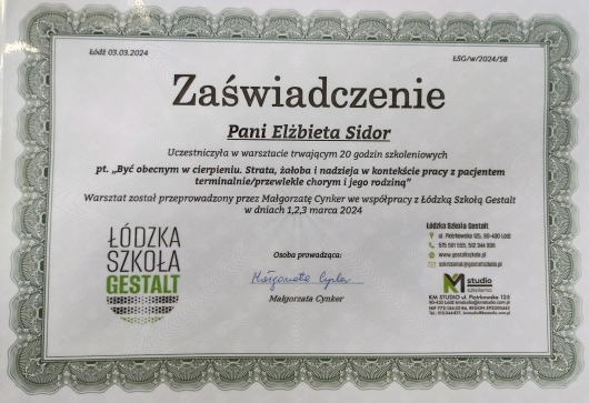 Jestem członkinią Polskiego Towarzystwa Psychoterapii Gestalt, pracuję w oparciu o Kodeks Etyki Zawodowej Europejskiego Stowarzyszenia Terapii Gestalt, a także regularnie korzystam z merytorycznego wsparcia certyfikowanych superwizorów.