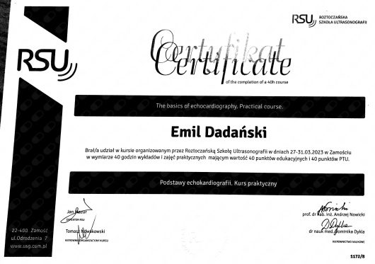 Jaki jest zakres porad oferowanych przez Emil Dadański?Emil Dadański to w trakcie specjalizacji (kardiolog). Na podstawie swojego doświadczenia i wykształcenia Emil Dadański oferuje usługi takie jak: konsultacja kardiologiczna + EKG + ECHO serca, konsultacja kardiologiczna + EKG, Konsultacja kardiologiczna + EKG (pierwszorazowa), USG doppler tętnic szyjnych i kręgowych, USG doppler żył kończyn dolnych (2 kończyny), USG doppler tętnic nerkowych, USG doppler aorty i tętnic biodrowych, konsultacja kardiologiczna, ECHO serca, konsultacja kardiologiczna + ECHO serca.
