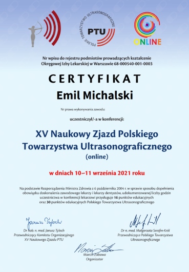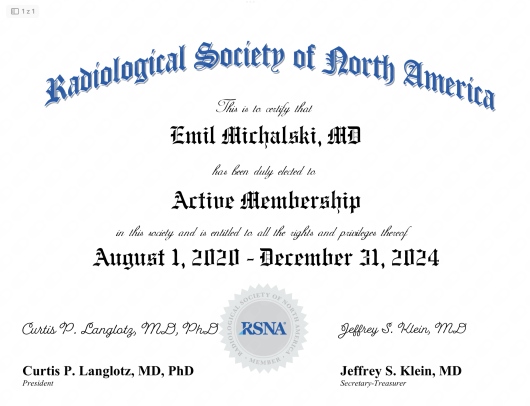 Lekarz specjalista radiologii i diagnostyki obrazowej, doktor nauk medycznych. Swoją wiedzę i umiejętności potwierdziłem, zdając europejski egzamin specjalizacyjny – European Diploma in Radiology (EDiR).