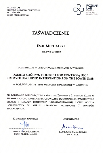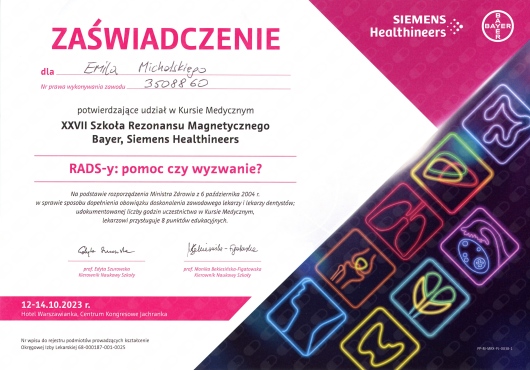 Szkolenie specjalizacyjne z radiologii i diagnostyki obrazowej zrealizowałem w Narodowym Instytucie Geriatrii, Reumatologii i Rehabilitacji im. prof. dr hab. med. Eleonory Reicher w Warszawie. Kompetencje rozwijałem również m.in. w: Szpitalu Klinicznym im. W. Orłowskiego, Szpitalu Bielańskim oraz Instytucie Psychiatrii i Neurologii. Jestem uczestnikiem licznych szkoleń, zjazdów i konferencji w Europie i Stanach Zjednoczonych. Posiadam norweskie prawo wykonywania zawodu lekarza oraz autoryzację specjalizacji z radiologii i diagnostyki obrazowej, uprawniające do wykonywania zawodu na terytorium Królestwa Norwegii - numer HPR 10105303.
