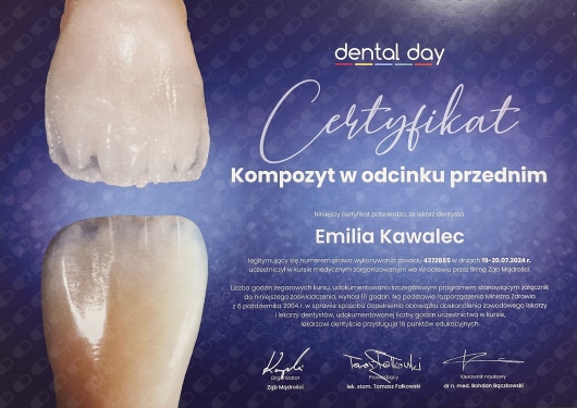 Jaki jest zakres porad oferowanych przez Emilia Kawalec?Emilia Kawalec to stomatolog. Na podstawie swojego doświadczenia i wykształcenia Emilia Kawalec oferuje usługi takie jak: Konsultacja stomatologiczna, konsultacja stomatologiczna dzieci, leczenie próchnicy, Leczenie próchnicy u dzieci, leczenie nagłego bólu zęba.