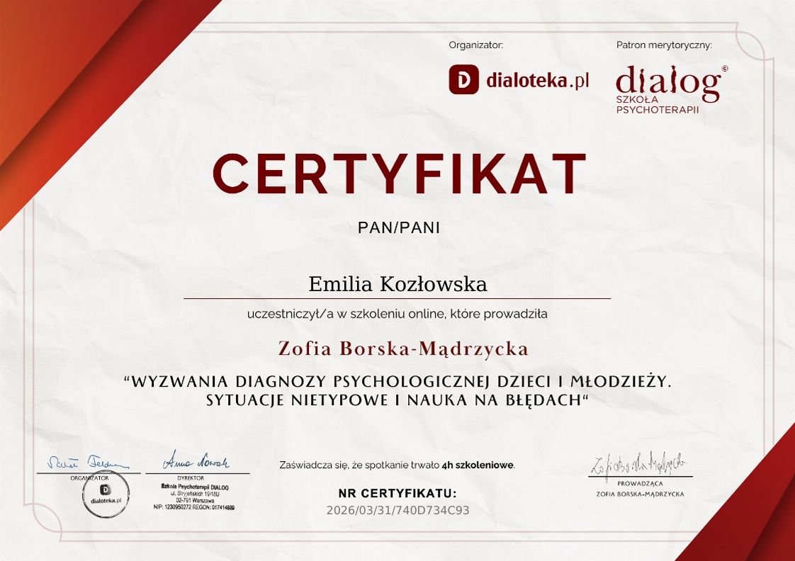 Biorę udział w superwizjach oraz licznych szkoleniach i konferencjach. Pracuję zgodnie z kodeksem etycznym, tym samym jestem zobowiązana do przestrzegania tajemnicy zawodowej.