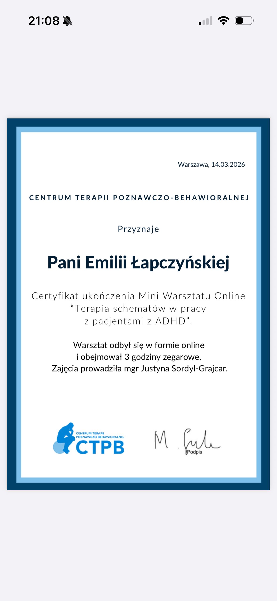 Jestem w trakcie 4-letniego szkolenia z zakresu psychoterapii poznawczo- behawioralnej (CBT) i schematu w Akademii Psychoterapii INTEREGO w Warszawie, które jest rekomendowane przez Polskie Towarzystwo Terapii Poznawczej i Behawioralnej (PTTPB).