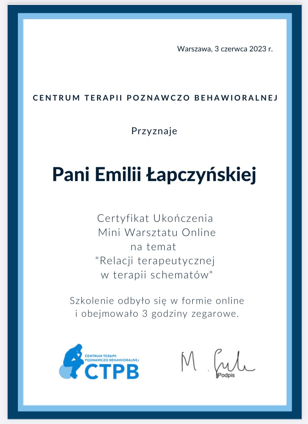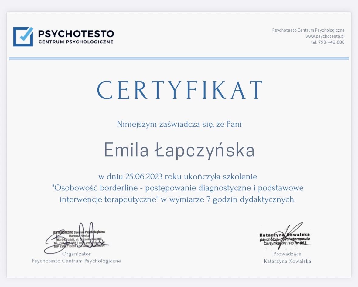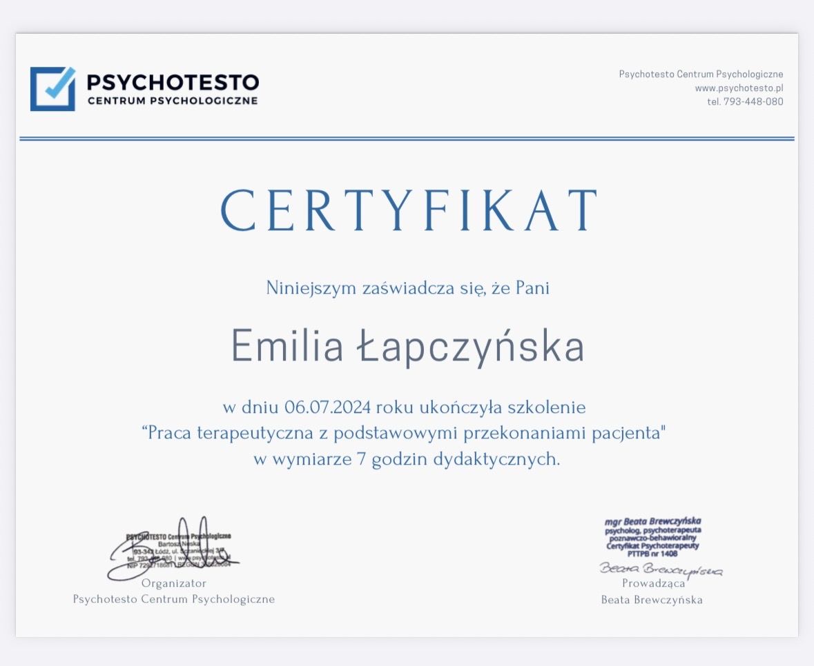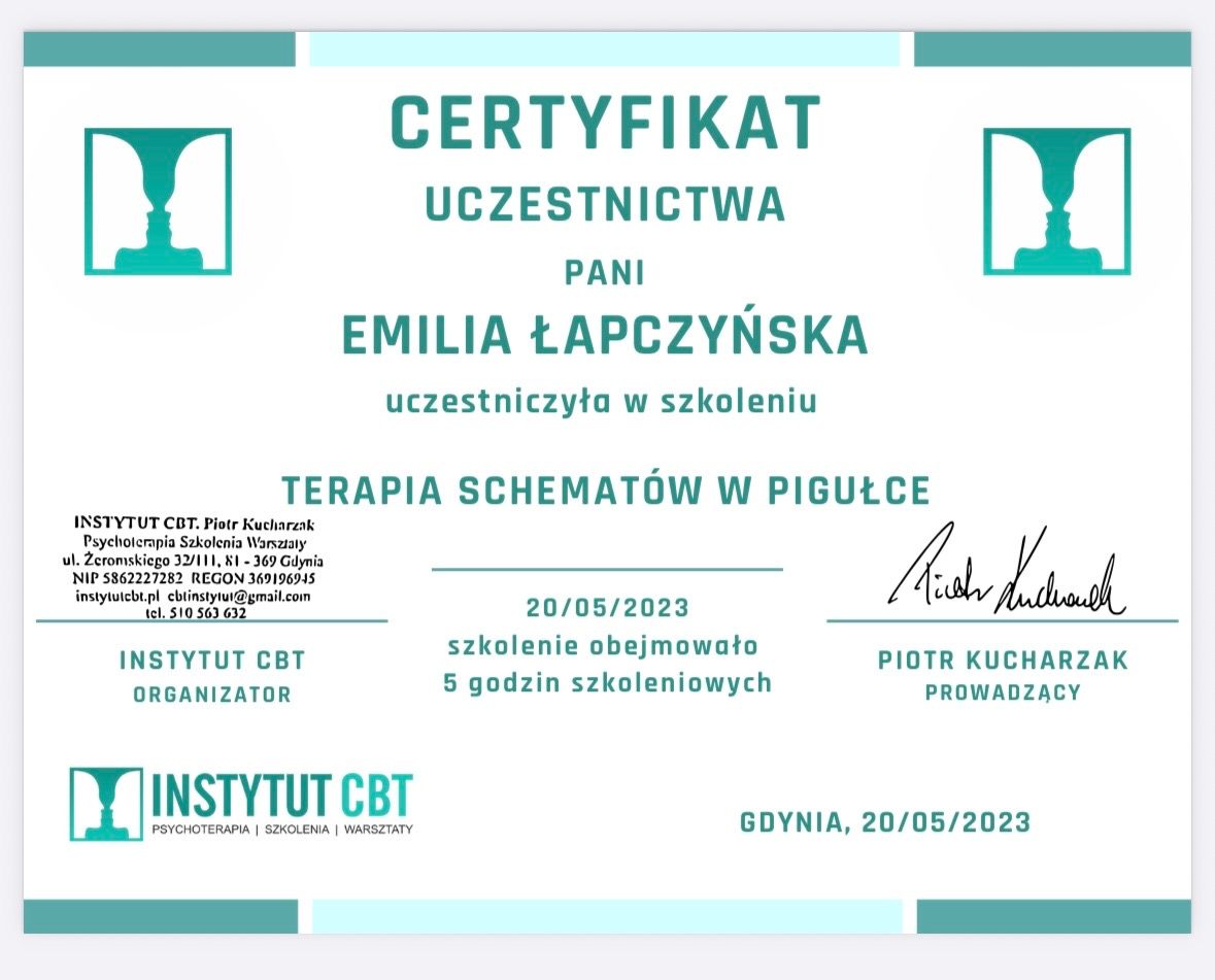 Jestem w trakcie 4-letniego szkolenia z zakresu psychoterapii poznawczo- behawioralnej (CBT) i schematu w Akademii Psychoterapii INTEREGO w Warszawie, które jest rekomendowane przez Polskie Towarzystwo Terapii Poznawczej i Behawioralnej (PTTPB).