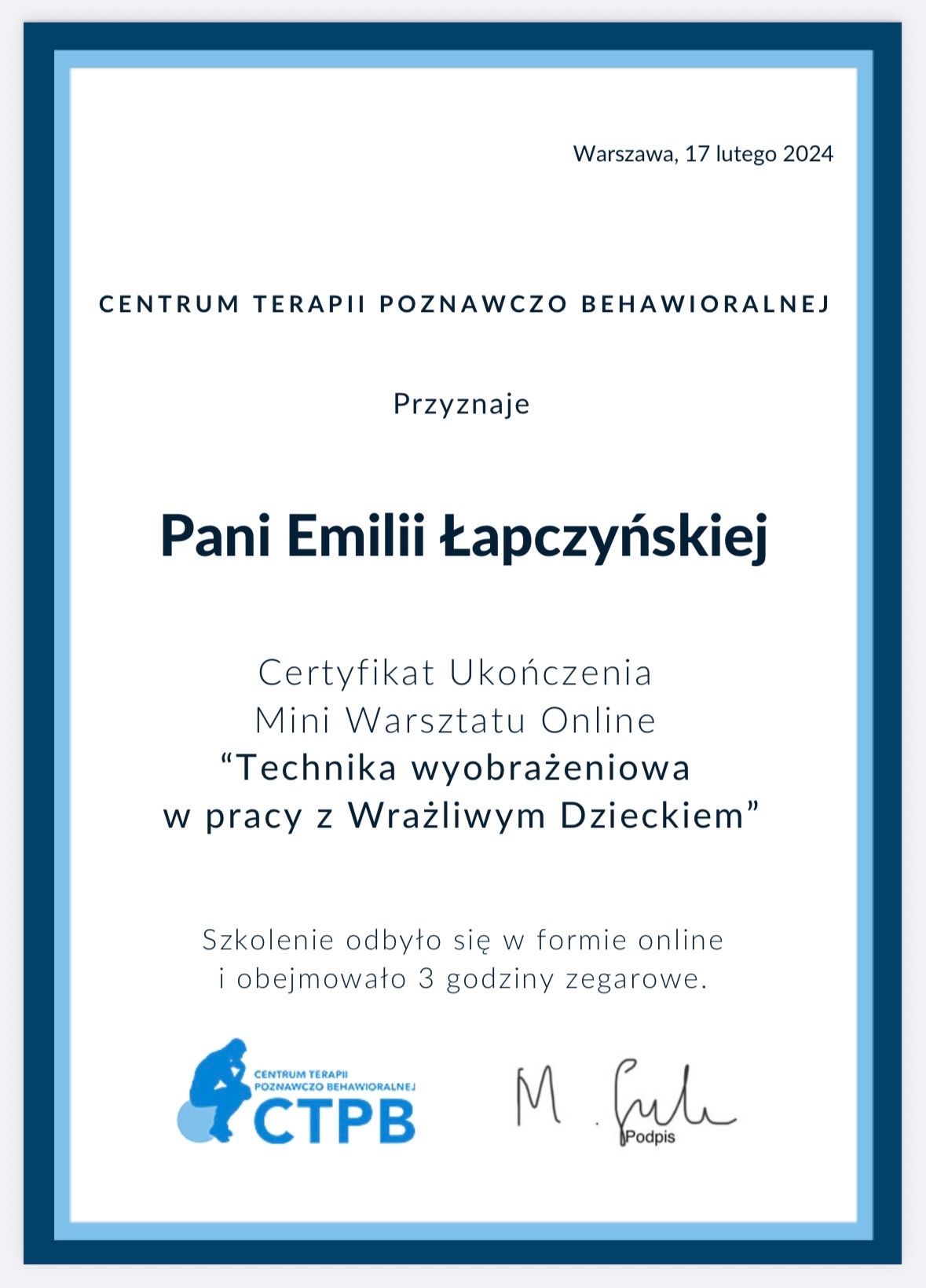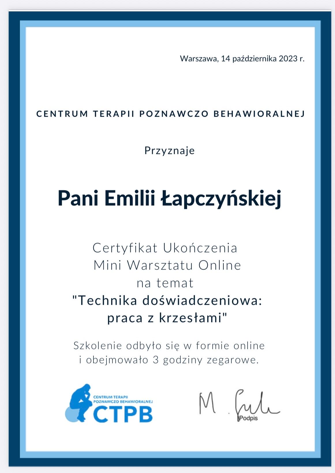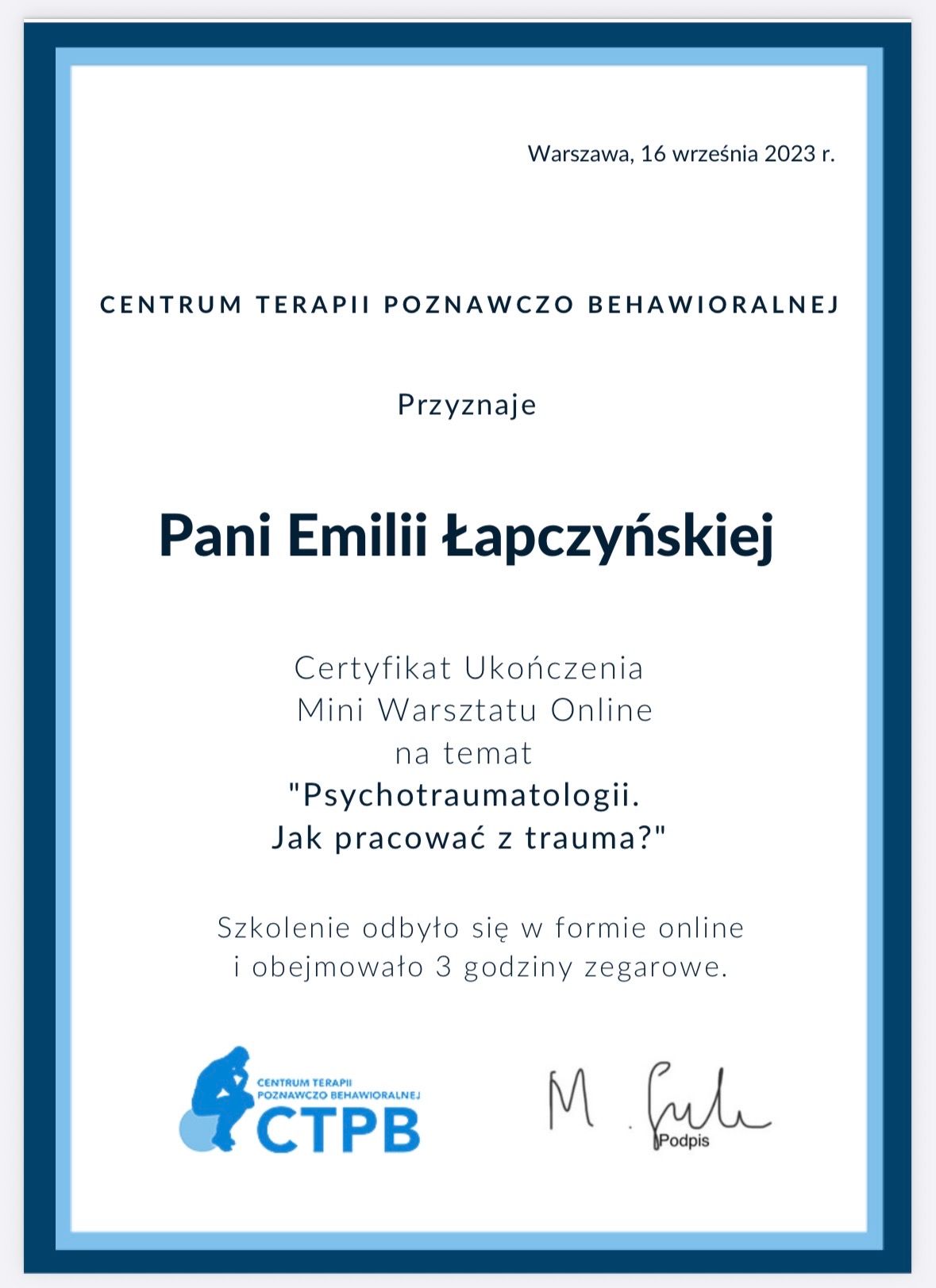 Jestem w trakcie 4-letniego szkolenia z zakresu psychoterapii poznawczo- behawioralnej (CBT) i schematu w Akademii Psychoterapii INTEREGO w Warszawie, które jest rekomendowane przez Polskie Towarzystwo Terapii Poznawczej i Behawioralnej (PTTPB).