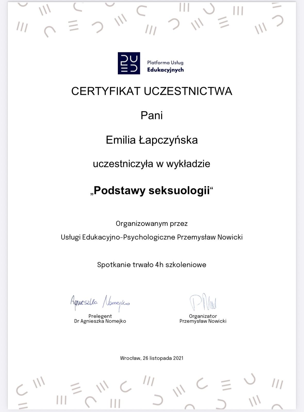 Nieustannie podnoszę swoje kwalifikacje biorąc udział w różnych szkoleniach i warsztatach terapeutycznych.