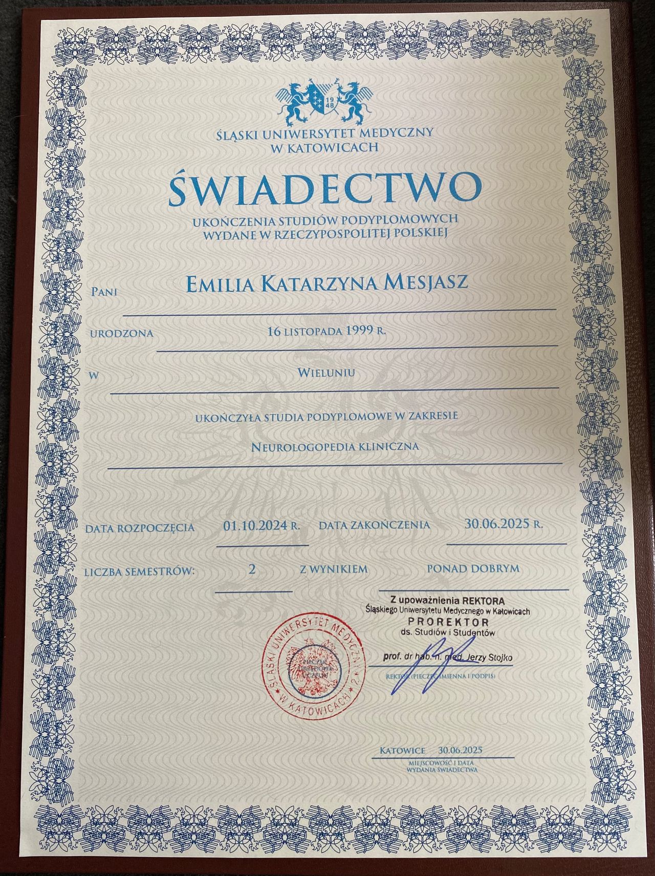 Jestem specjalistą z doświadczeniem w terapii dzieci oraz osób dorosłych z różnorodnymi trudnościami komunikacyjnymi i rozwojowymi. Ukończyłam logopedię na Uniwersytecie Jagiellońskim w Krakowie, a także studia podyplomowe z neurologopedii klinicznej na Śląskim Uniwersytecie Medycznym w Katowicach. Na co dzień wspieram pacjentów w przezwyciężaniu trudności związanych z mową, językiem, słuchem. W pracy kieruję się indywidualnym podejściem oraz budowaniem relacji opartej na zaufaniu i współpracy – z empatią, zaangażowaniem i wiarą w możliwości każdej osoby. Prowadzę terapię w przypadku takich trudności jak: