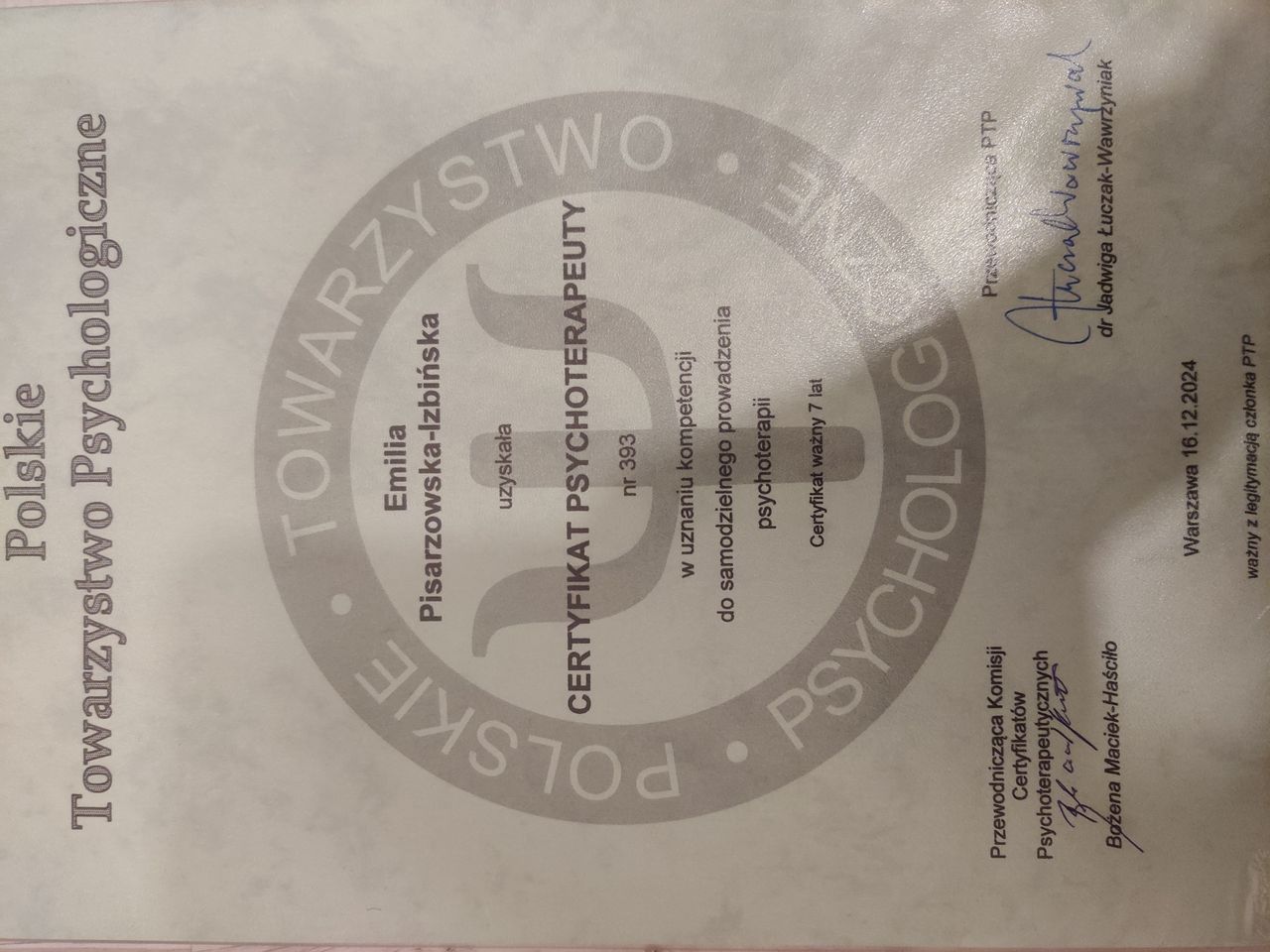 Jaki jest zakres porad oferowanych przez Emilia Pisarzowska-Izbińska?Emilia Pisarzowska-Izbińska to psychoterapeuta certyfikowany, psycholog. Na podstawie swojego doświadczenia i wykształcenia Emilia Pisarzowska-Izbińska oferuje usługi takie jak: psychoterapia indywidualna, konsultacja psychoterapeutyczna, Konsultacja pary, terapia par.