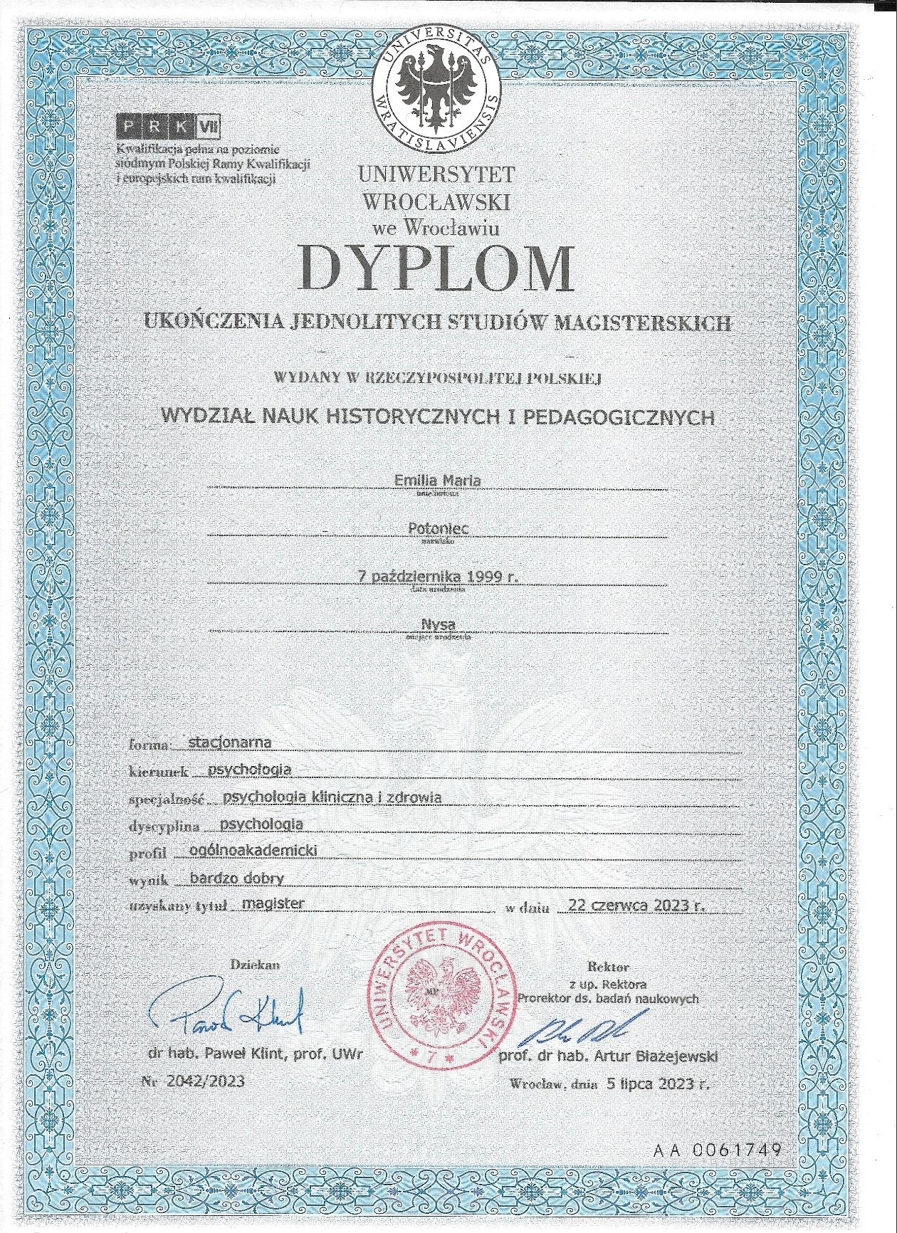 Nieustannie rozwijam swoje kompetencje, biorąc udział w licznych kursach oraz studiach podyplomowych. W najbliższym czasie planuję rozpocząć czteroletnią szkołę psychoterapii poznawczo-behawioralnej, aby jeszcze skuteczniej wspierać moich pacjentów w ich rozwoju i zdrowiu psychicznym.