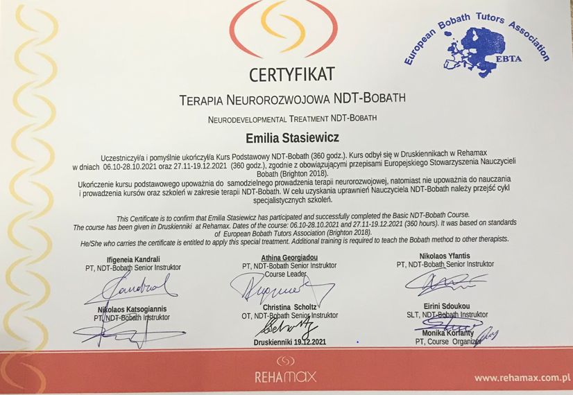 Jaki jest zakres porad oferowanych przez Emilia Stasiewicz?Emilia Stasiewicz to fizjoterapeuta dziecięcy, fizjoterapeuta. Na podstawie swojego doświadczenia i wykształcenia Emilia Stasiewicz oferuje usługi takie jak: fizjoterapia, Rehabilitacja dzieci metodą NDT Bobath.