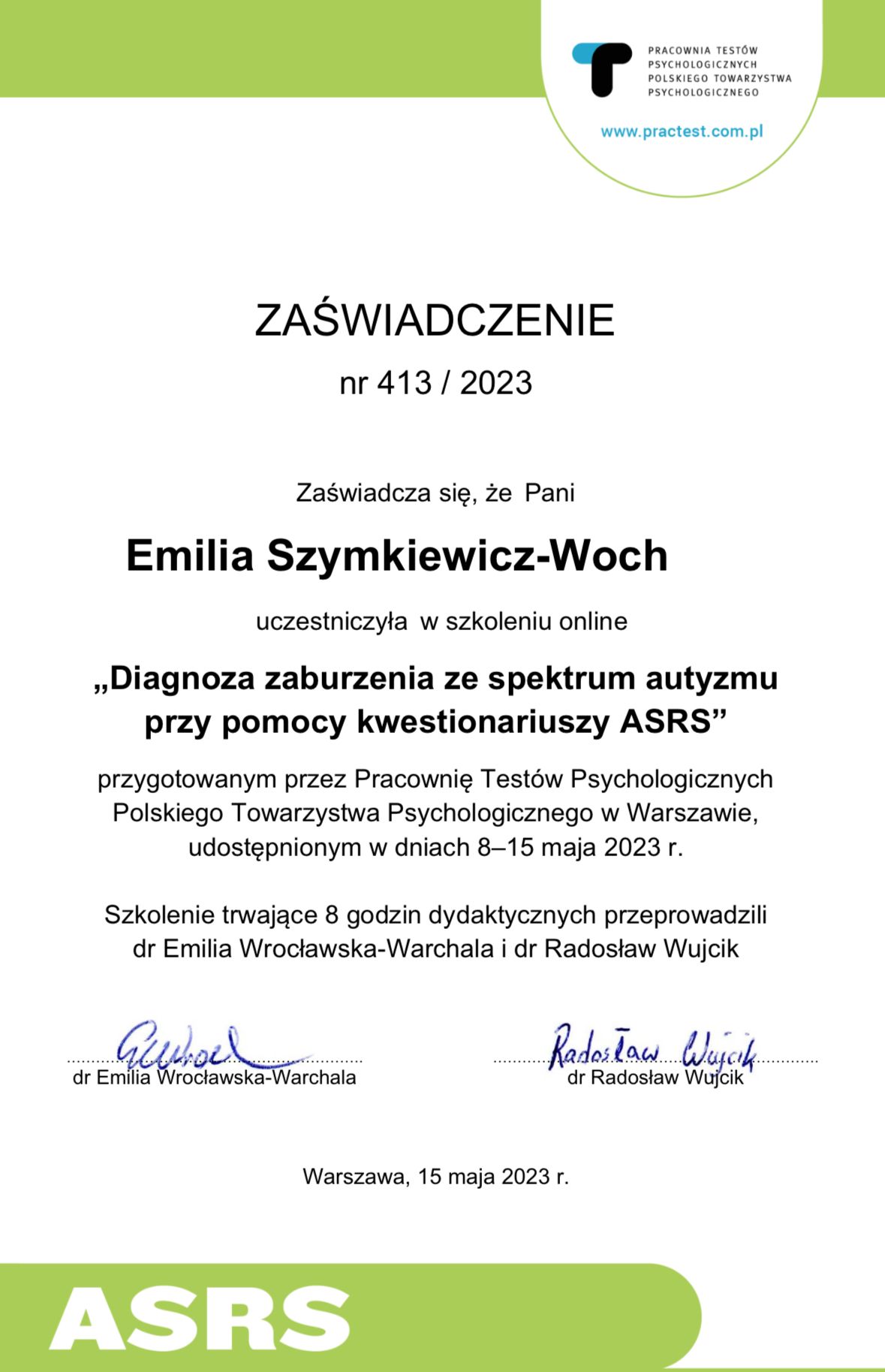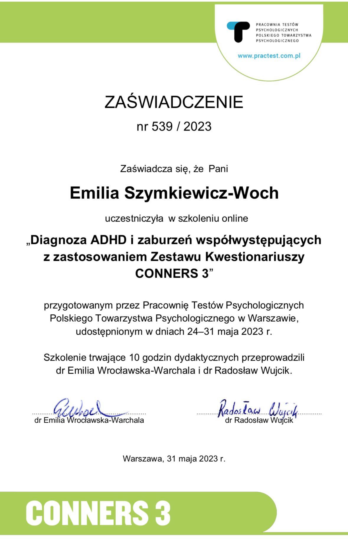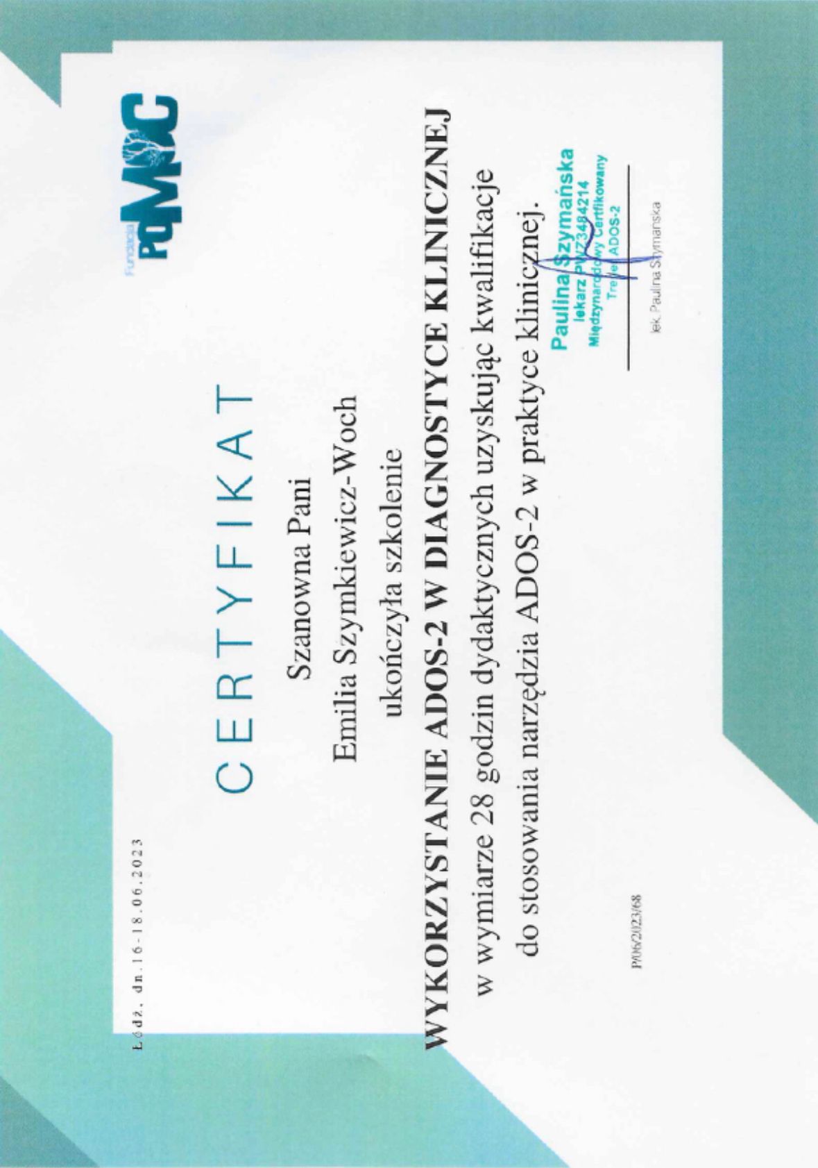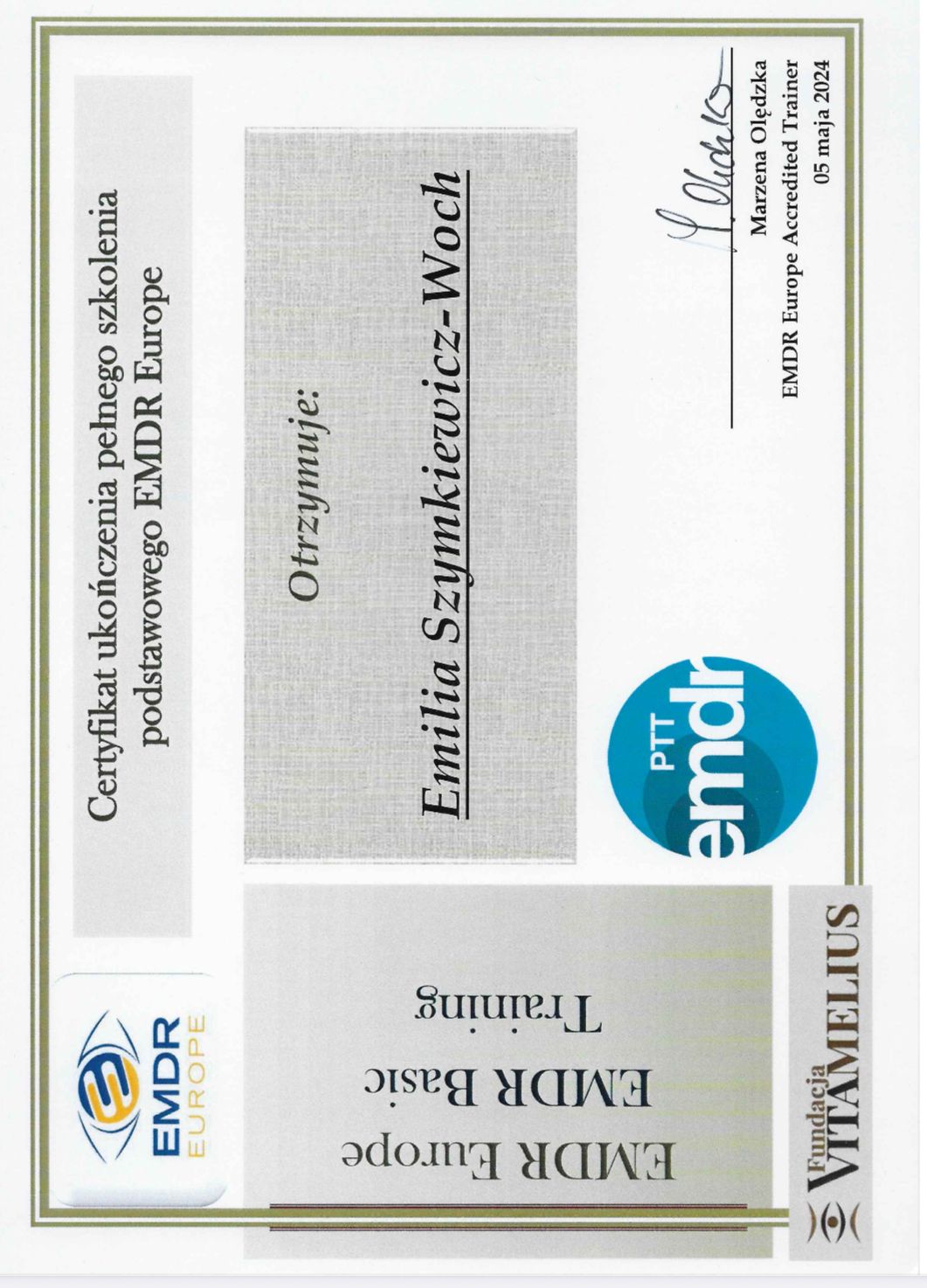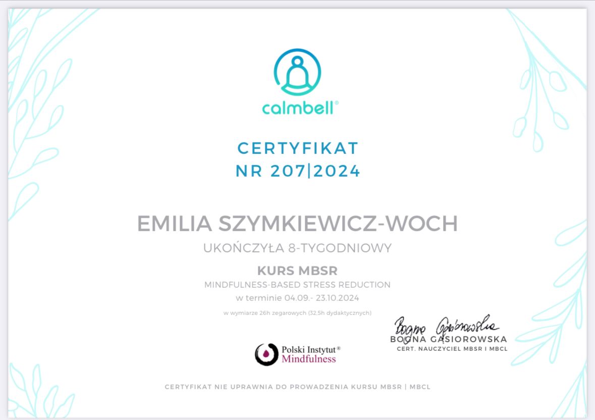 Jestem psychotraumatologiem (pracuje z PTSD i cPTSD), ukończyłam studia podyplomowe z tego obszaru, pracuje rekomendowaną przez WHO do pracy z traumą metodą EMDR. Jestem certyfikowanym terapeutą EMDR dla dzieci i młodziezy st II i dla dorosłych również st II. Zajmuje się diagnozą w obszarze zaburzeń ze spektrum (Autyzm, Asperger) oraz ADHD i depresji posiadam certyfikaty: ADOS-2, ASRS, Conners, CDI-2. Posługuje się również testem Diva-5. Pisze opinie. Jestem również Terapeutą par, ukończyłam Studium Terapii Par. Na codzień pracuje w nurcie CBT (poznawczo-behawioralna) jestem po Kursie i Stażu łącznie 220h szkoleniowych. Wiedze teoretyczną wsparłam wieloletnią praktyką pracując w Mazowieckim Centrum Neuropsychiatrii dla dzieci i młodzieży w Warszawie w trzech poradniach Autystycznej, Poradni Zdrowia Psychicznego (PZP Diagnostyka) i Poradni Psychologicznej oraz przyjmowałam w dwóch prywatnych poradniach. Pracuje pod stała superwizją. Lubie słuchać i pomagać ludziom, patrzeć jak pokonują swoje lęki/traumy, słabości, trudności jak układają siebie od nowa !!!