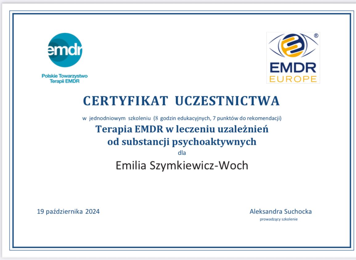 Terapia EMDR z Panią Emilią niesie ze sobą bardzo dobre efekty już po pierwszych sesjach. Polecam Panią Emilię bez zastrzeżeń-to profesjonalistka.