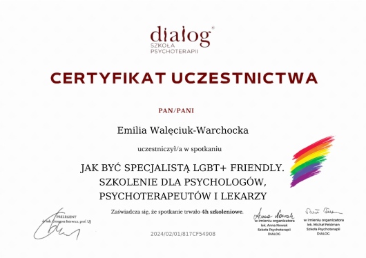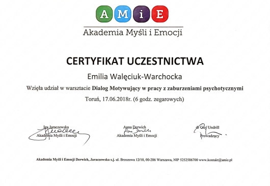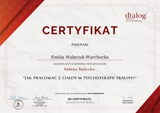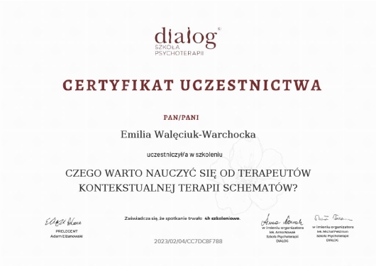 Uczęszczałam do pani Emilii kilka lat i zawsze czułam ogromne wsparcie z jej strony. Wiele moich problemów udało mi się rozwiązać podczas sesji z panią Emilią. Pani Emilia jest zawsze serdeczna i otwarta, człowiek czuje się przy niej zaopiekowany. Polecam serdecznie tego terapeutę.