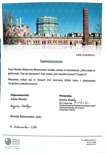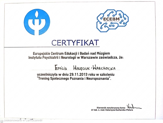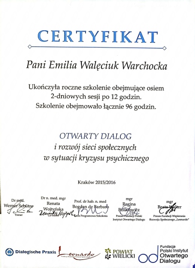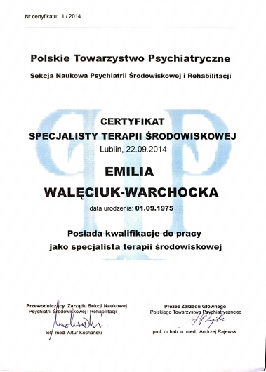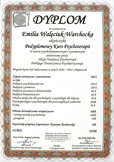 Ukończyłam 4,5 letni kurs psychoterapeutyczny atestowany przez Sekcję Naukową Polskiego Towarzystwa Psychiatrycznego. Od ponad 20 lat zdobywam doświadczenie w pracy terapeutycznej, które nabywałam pracując w placówkach tj.: Szpital psychiatryczny, Oddział całodobowy, Oddział dzienny, Poradnia Zdrowia Psychicznego, Zespół Leczenia Środowiskowego i w Gabinecie psychoterapeutycznym. Jestem wpisana na listę psychoterapeutów i superwizorów SNP PTP - Sekcja Naukowa Psychoterapii.