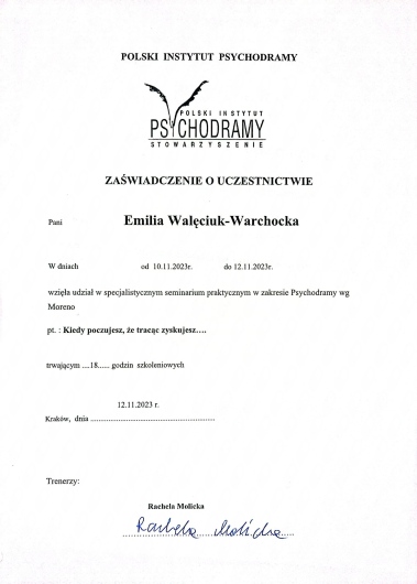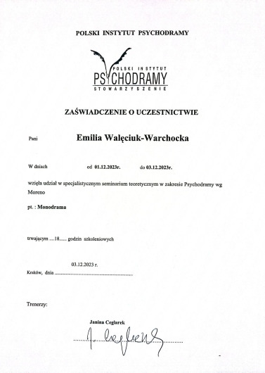 Warsztat pracy w prowadzeniu procesu klienta uzupełniam techniką monodramy wg Moreno, która pozwala szybciej dotrzeć do rozumienia problemu przez klienta. Praca monodramatyczna skierowana jest na m.in. na uczucia, osoby, relacje, zjawiska, objawy przez co daje możliwość głębszego rozumienia, wejścia w interakcję i sprawdzenia tych doświadczeń.