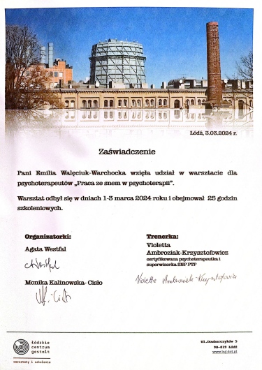 Swoich klientów zapraszam także do szukania rozumienia ich snów, by mogli łączyć za ich pomocą to co w życiu świadome z tym co nieświadome, co przybliża do rozumienie własnych przeżyć, wyborów, decyzji.
