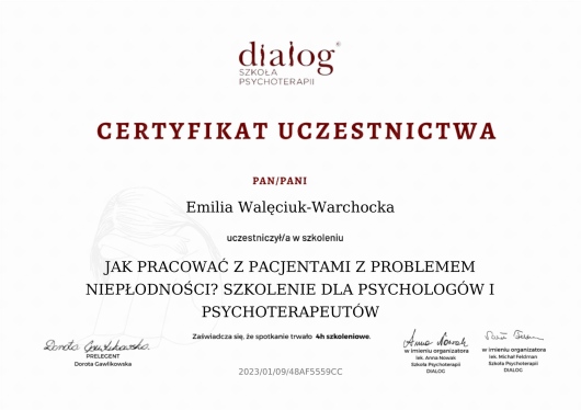 Jak Emilia Walęciuk-Warchocka umawia wizyty?Emilia Walęciuk-Warchocka używa kalendarza ZnanyLekarz, dlatego na stronie widzisz aktualne terminy. Wystarczy, że wybierzesz datę i godzinę, które odpowiadają Ci najbardziej. Umawianie wizyty jest darmowe, a tuż przed terminem wyślemy Ci przypomnienie.