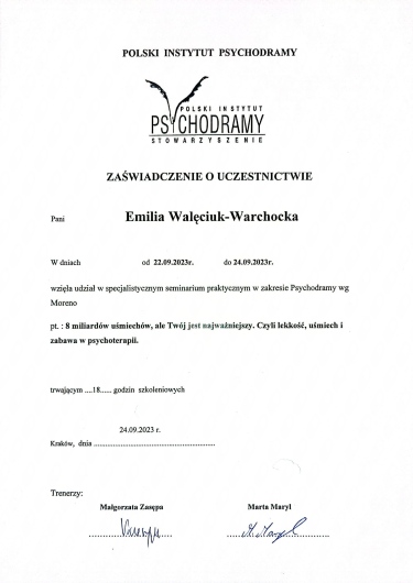 Pani Emilia jest ciepła, wyrozumiała i bardzo empatyczną osobą. Stworzyła w swoim gabinecie atmosferę życzliwości bez oceny i krytyki, co daje możliwość przeżycia trudnych emocji i doświadczeń, z którymi się borykamy. Jest niezwykle wrażliwa i autentyczna. Baczny obserwator i nauczyciel, który nie daje ryby, tylko wędkę i stwarza możliwość samodzielnej nauki wędkowania.