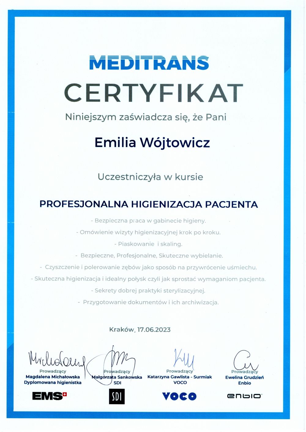 Czułam się zaopiekowana przez cały czas trwania wizyty. Pani Emilia była bardzo delikatna, a zarazem skuteczna - jestem zadowolona z efektu końcowego. Po wszystkim dostałam dużą dawkę wiedzy na temat właściwej higieny jamy ustnej. Serdecznie polecam Panią Emilię :-)