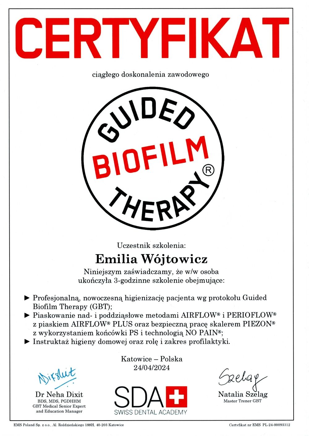 Jaki jest zakres porad oferowanych przez Emilia Wójtowicz-Majek?Emilia Wójtowicz-Majek to higienistka/higienista stomatologiczny. Na podstawie swojego doświadczenia i wykształcenia Emilia Wójtowicz-Majek oferuje usługi takie jak: scaling + piaskowanie, Scaling + fluoryzacja, Piaskowanie + fluoryzacja, lakierowanie zębów, profilaktyka próchnicy, Wybielanie zębów, nakładkowe wybielanie zębów, wybielanie zębów lampą, higienizacja.