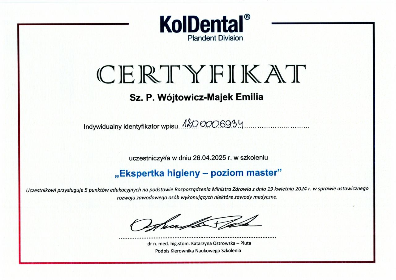 Jestem doświadczoną higienistką stomatologiczną, z pasją do dbania o zdrowie jamy ustnej moich pacjentów. Stawiam na indywidualne podejście, zapewniając komfort i bezpieczeństwo podczas każdej wizyty. Moja praca to nie tylko wykonywanie zabiegów higienizacyjnych, ale także edukacja pacjentów w zakresie profilaktyki stomatologicznej, aby wspólnie dbać o zdrowy i trwały uśmiech.