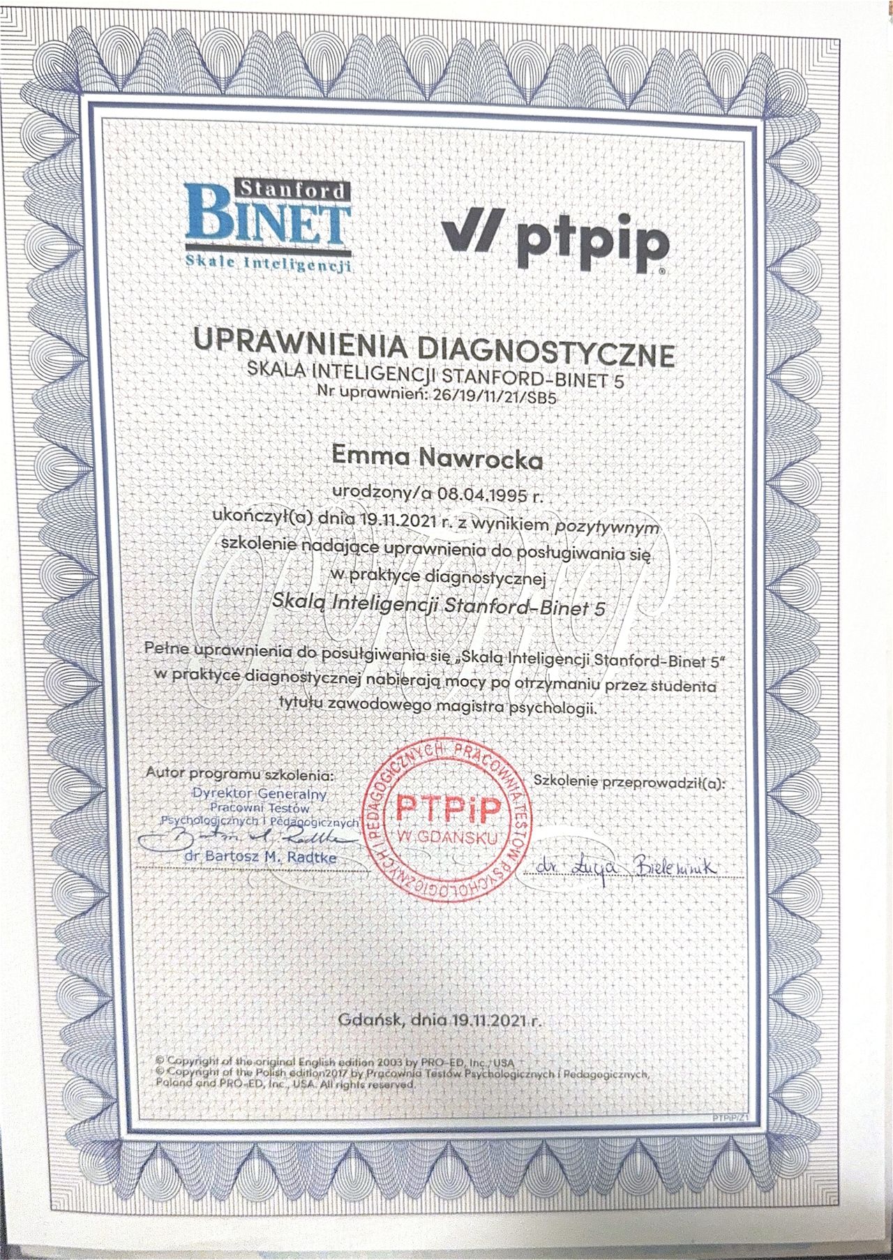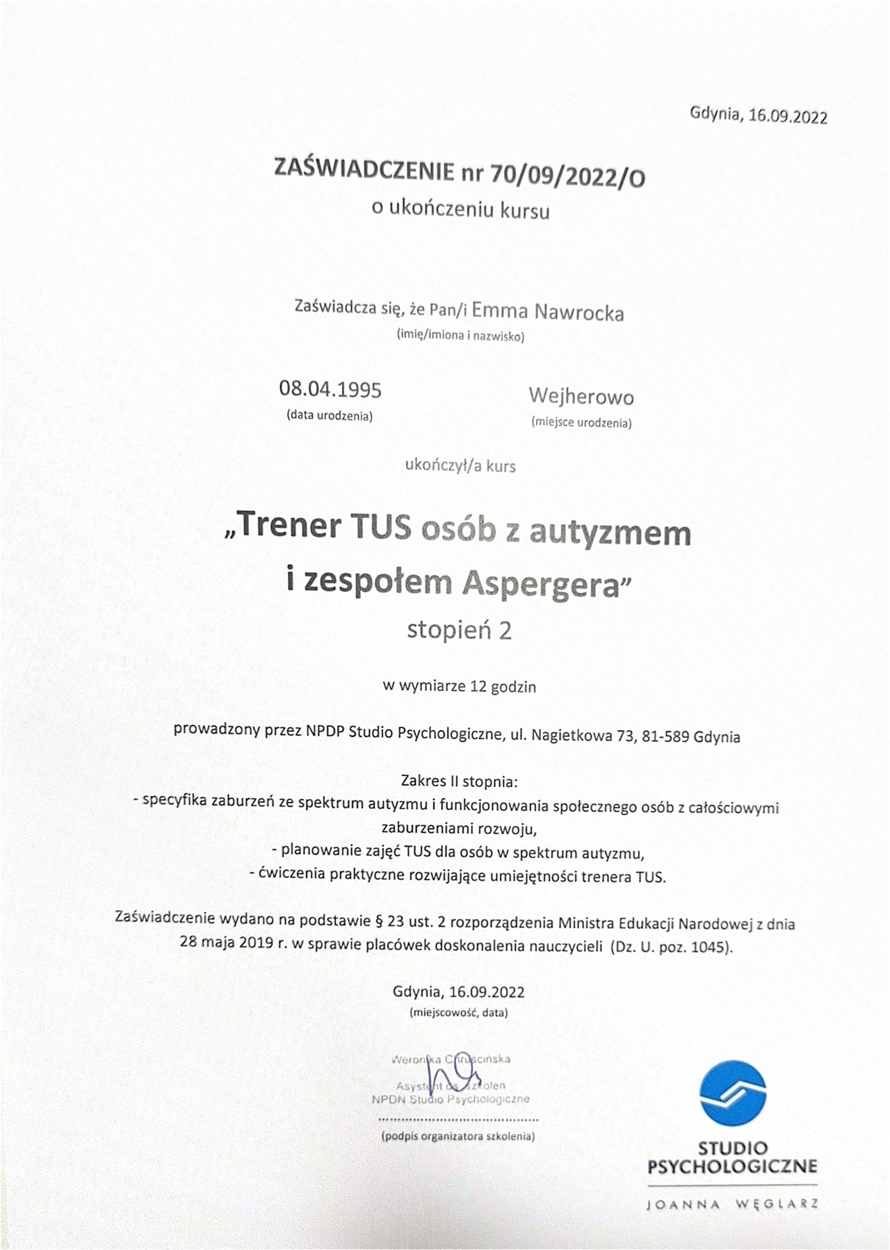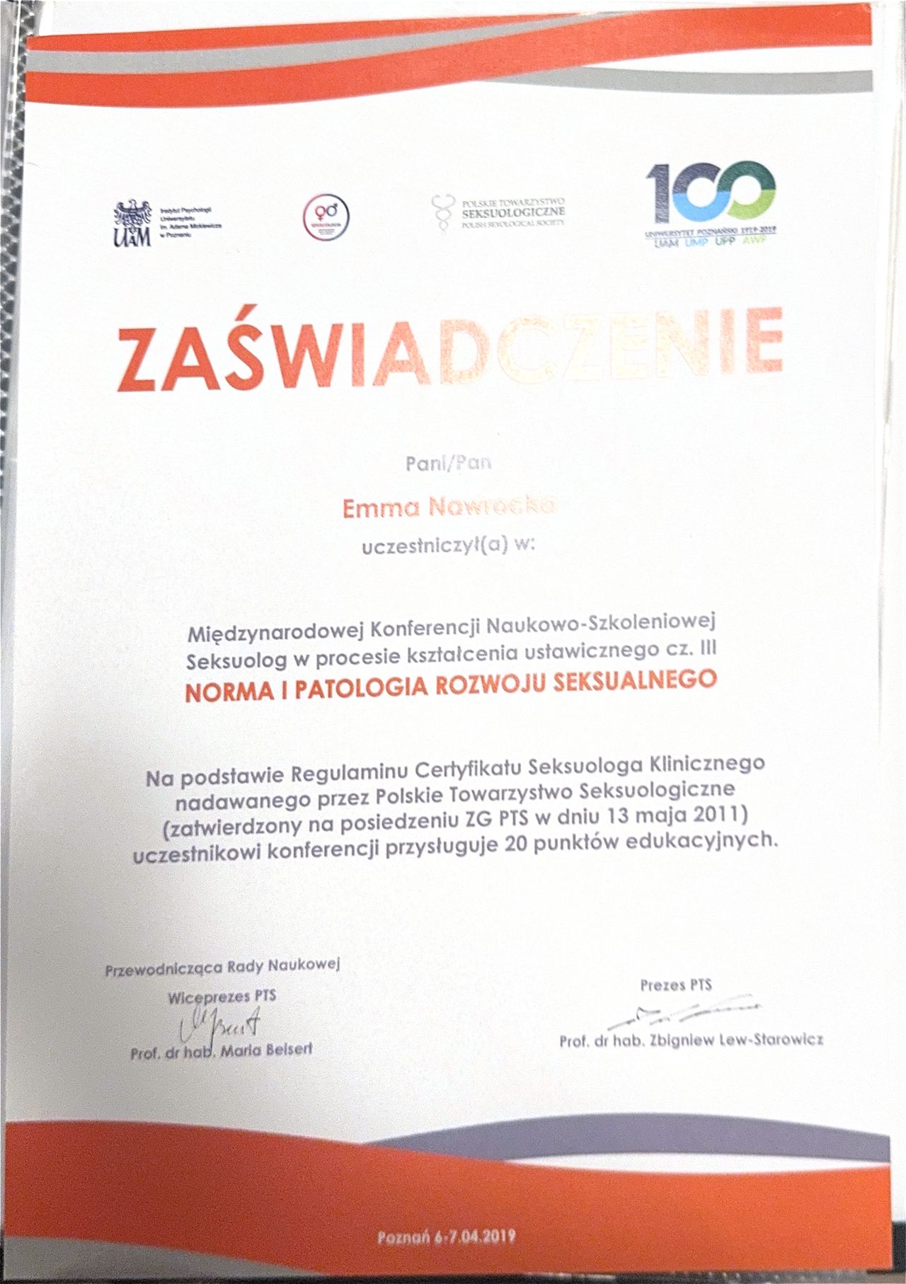Jestem absolwentką psychologii (o specjalności psychoseksuologia i specjalizacji pedagogicznej), socjologii oraz filozofii na Uniwersytecie Gdańskim. Ukończyłam także I. stopień Terapii Skoncentrowanej na Rozwiązaniach (TSR).