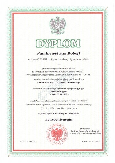 Świetny neurochirurg, kompetentny i empatyczny specjalista. Z zaangażowaniem słucha, notuje i weryfikuje dostarczone dokumenty. Bardzo życzliwy i przyjazny dla pacjenta. Pan Doktor rzeczowo przedstawia plan zabiegu oraz wyjaśnia jakie ryzyko niesie. Pan dr Bobeff znakomicie mało inwazyjnymi metodami przeprowadził u mnie operację (stabilizacja kręgosłupa), po której wracam do samodzielności. Panie Doktorze bardzo serdecznie dziękuję za pomoc. Pozdrawiam, a przyszłym pacjentom gorąco polecam wizyty u Pana.