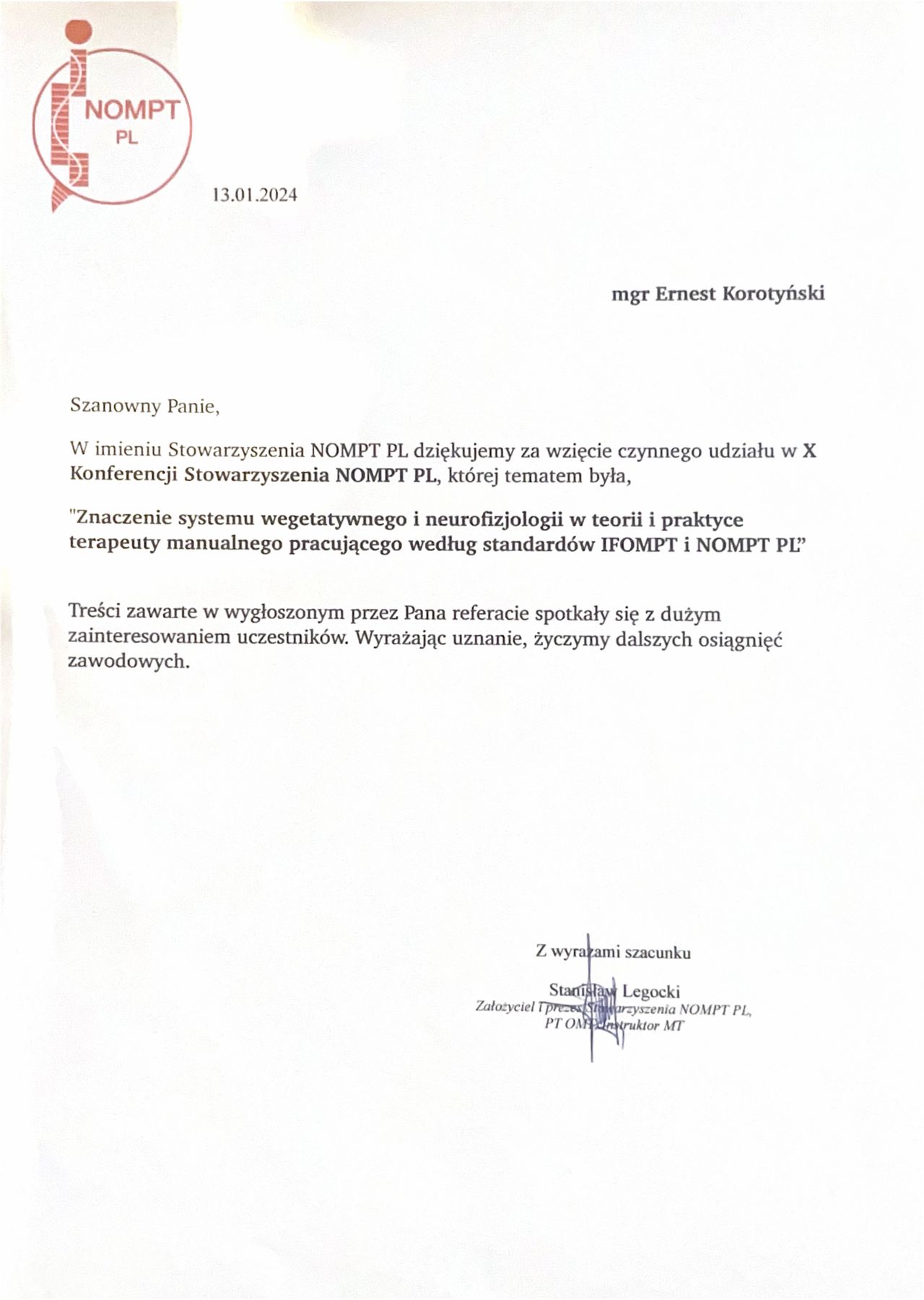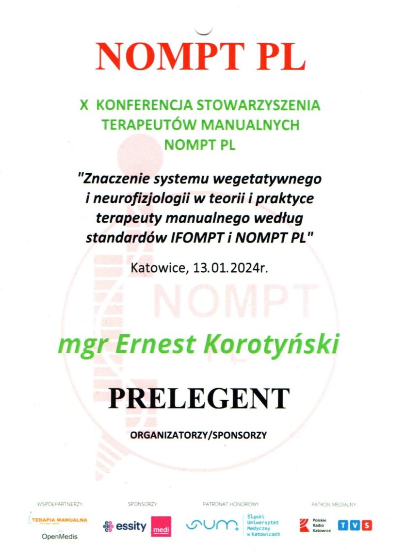 • Temat: Znaczenie systemu wegetatywnego i neurofizjologii w teorii i praktyce terapeuty manualnego pracujących według standardów IFOMPT i NOMPT PL