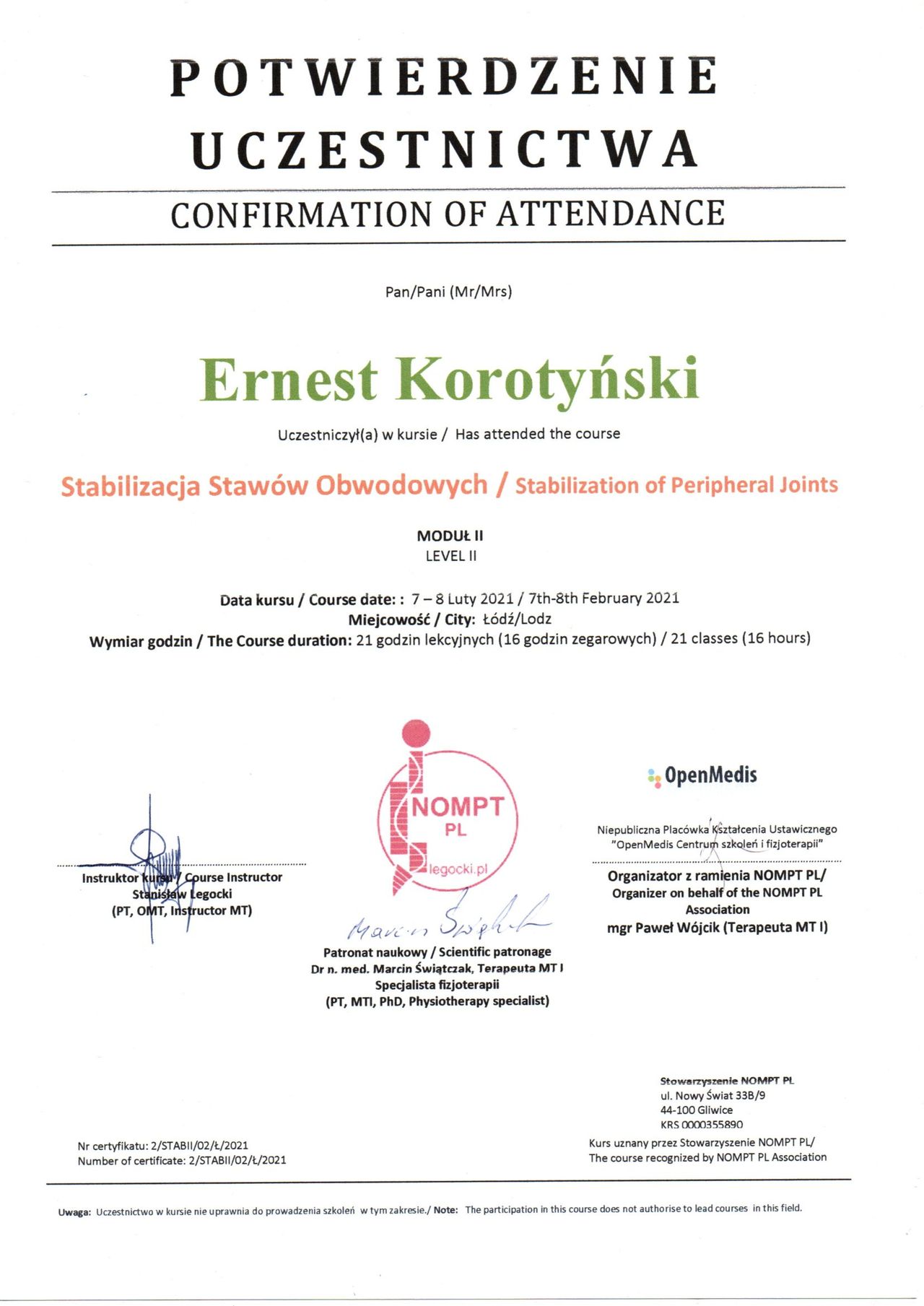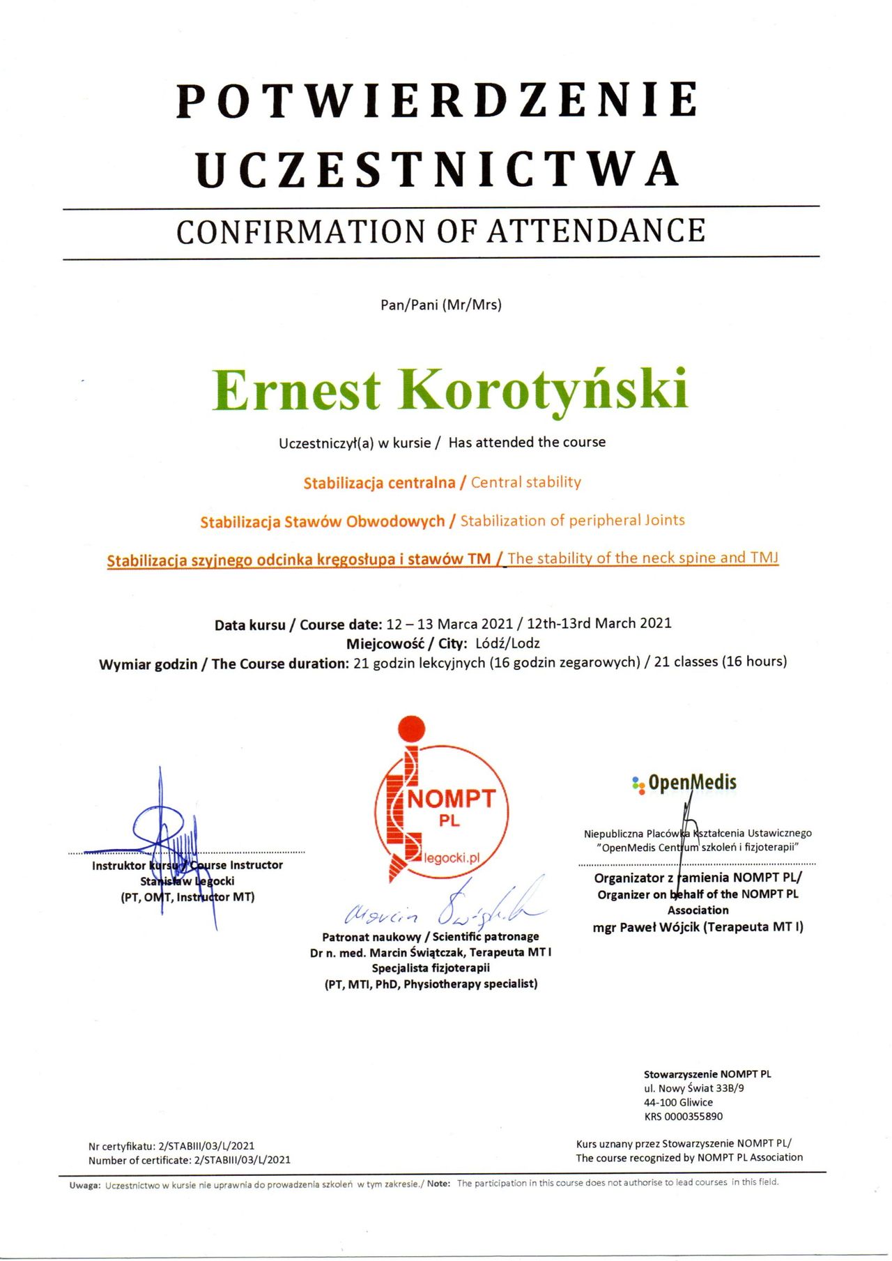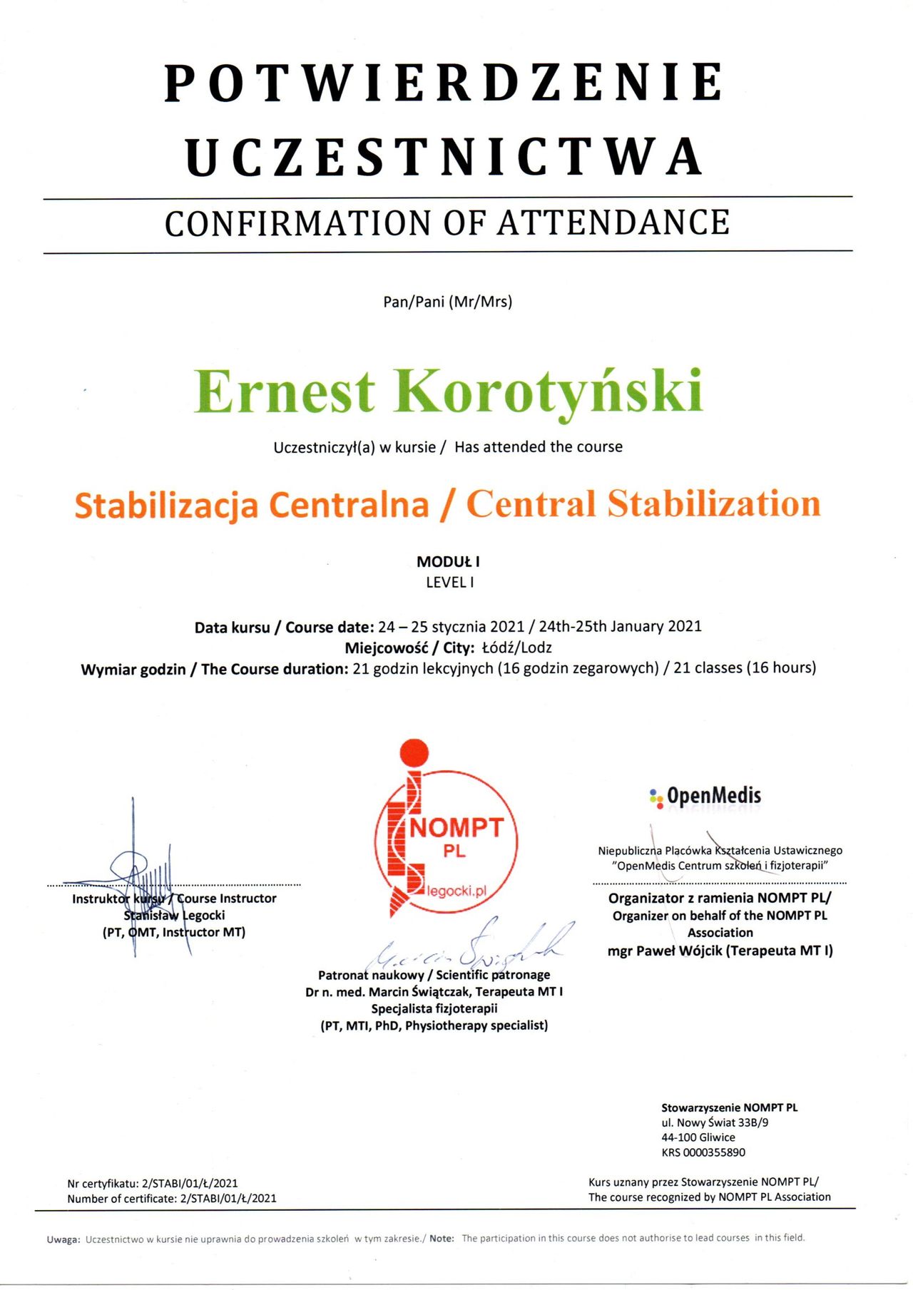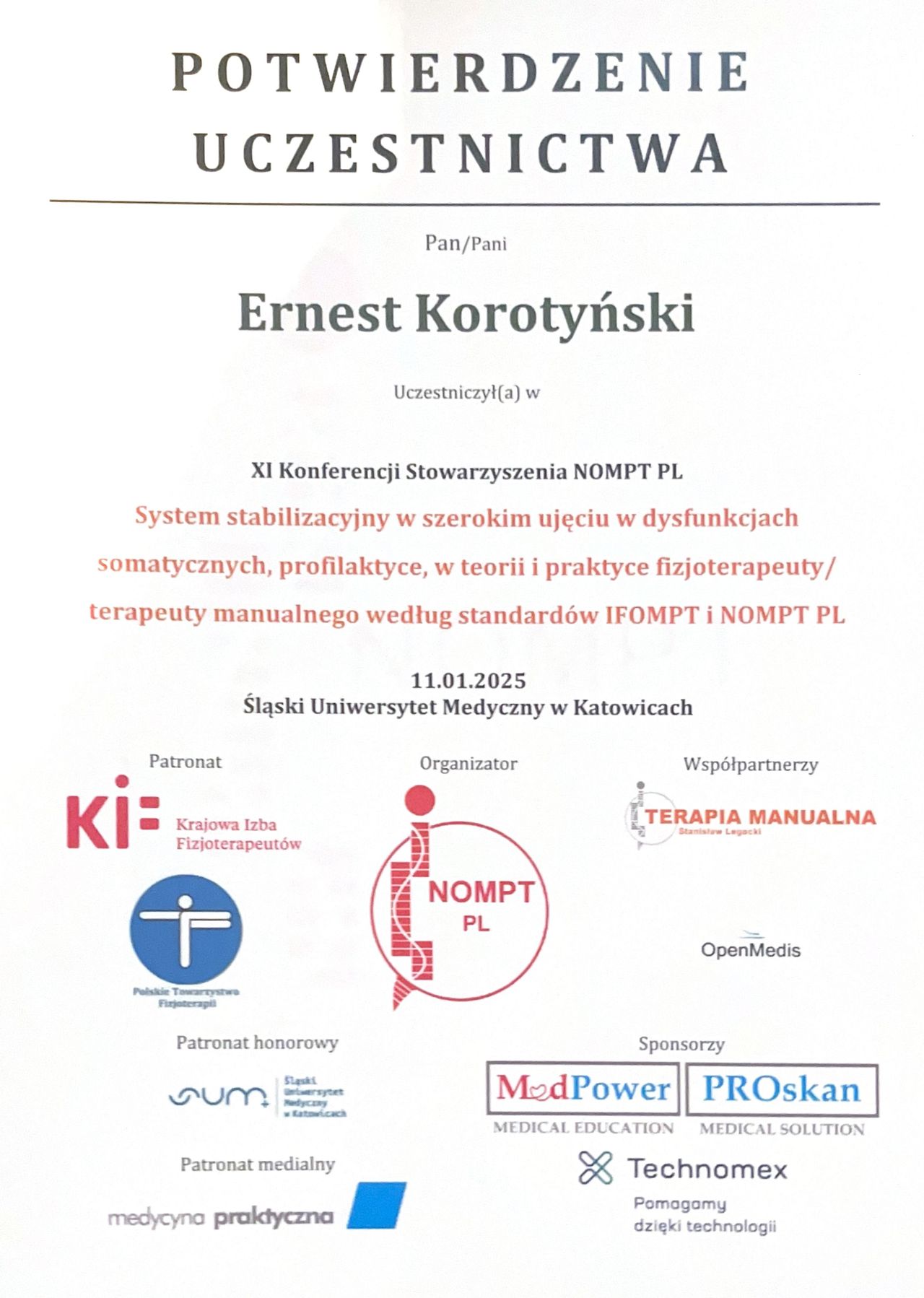 • Temat: System stabilizujący w szerokim ujęciu w dysfunkcjach somatycznych, profilaktyce, w teorii i praktyce fizjoterapeuty/ terapeuty manualnego według standardów IFOMPT i NOMPT PL