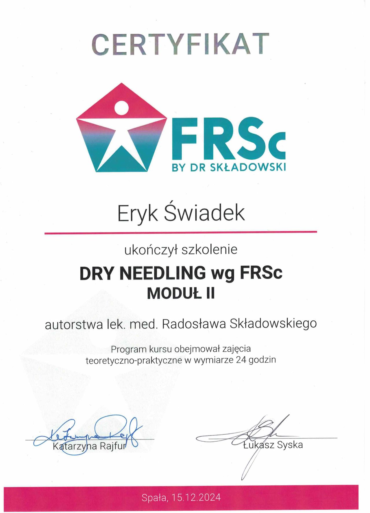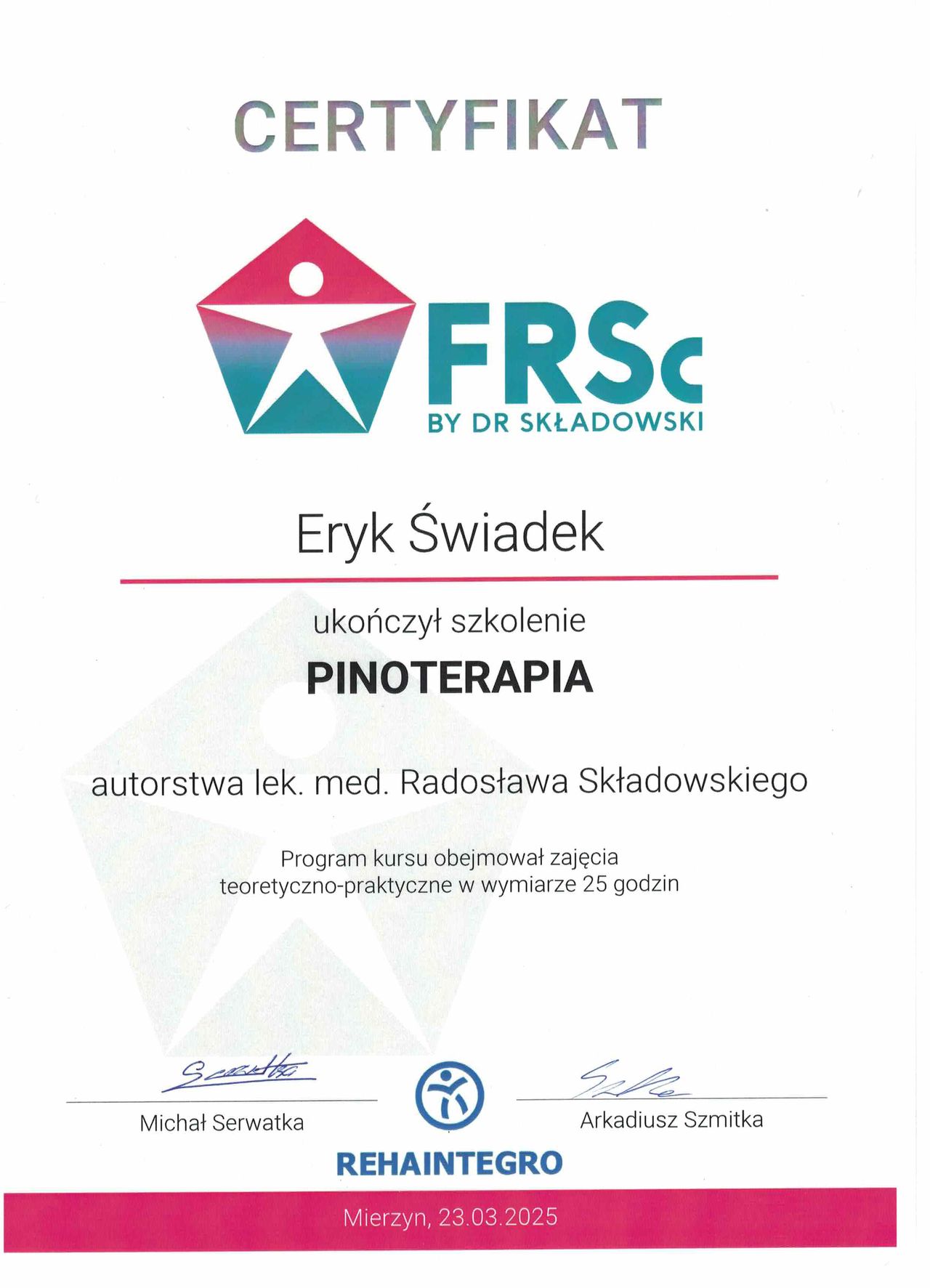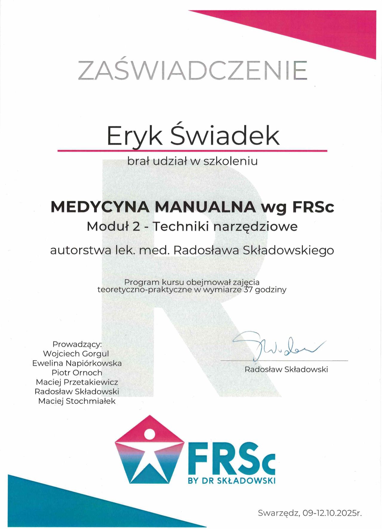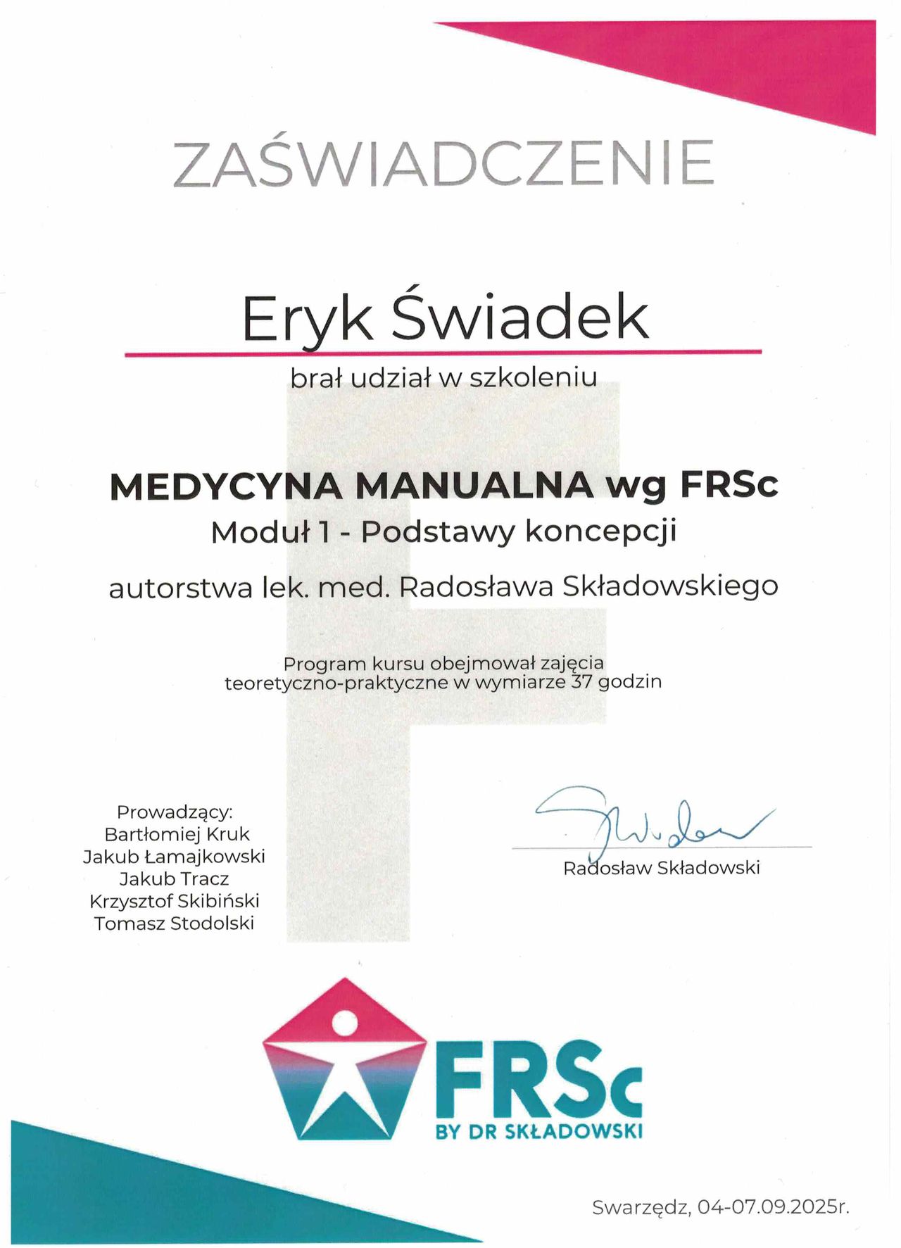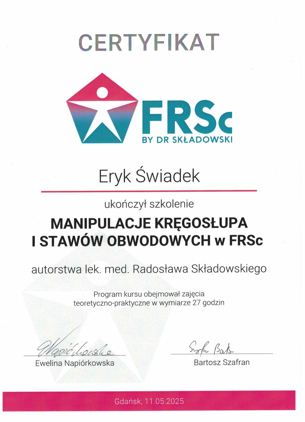 Stale rozwijam swoje umiejętności, uczestnicząc w licznych szkoleniach. Ukończyłem m.in. kursy manipulacji stawowej, pinoterapii, suchego igłowania (dry needling), treningu funkcjonalnego stopy oraz pierwszy i drugi moduł medycyny manualnej według koncepcji FRSc.