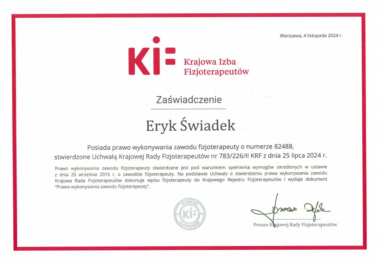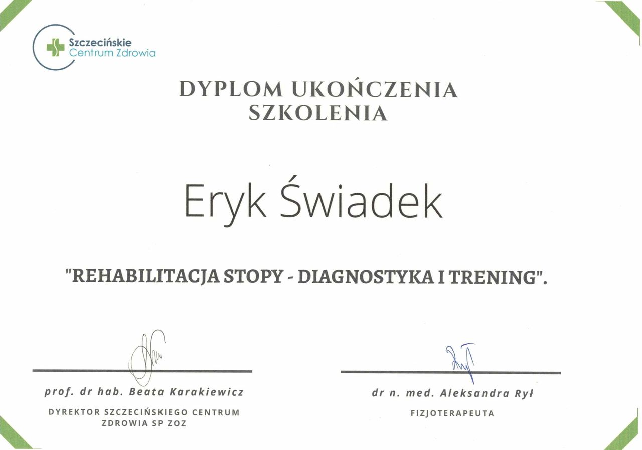 Nazywam się Eryk Świadek i jestem dyplomowanym fizjoterapeutą, absolwentem Pomorskiego Uniwersytetu Medycznego w Szczecinie. W swojej pracy koncentruję się przede wszystkim na terapii pacjentów z dolegliwościami bólowymi i problemami ortopedycznymi, często wynikającymi z siedzącego trybu życia, przeciążeń lub ograniczonej aktywności ruchowej.