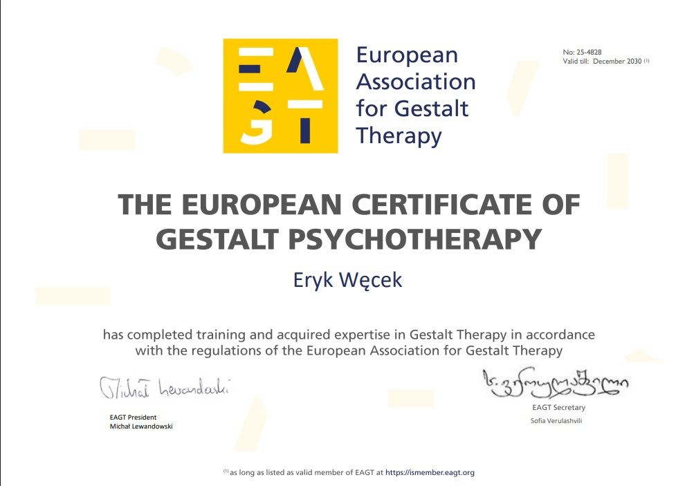 Nieprzerwanie pracuję nad rozwojem swoich kwalifikacji a moja praca podlega superwizji. W swojej pracy opieram się na kodeksie etycznym Polskiego Towarzystwa Psychoterapii Gestalt.