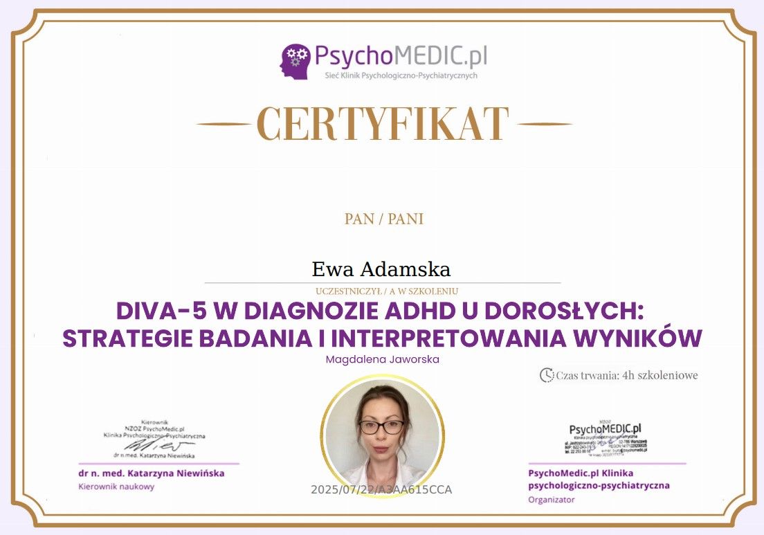 Jaki jest zakres porad oferowanych przez Ewa Adamska?Ewa Adamska to psycholog. Na podstawie swojego doświadczenia i wykształcenia Ewa Adamska oferuje usługi takie jak: interwencja kryzysowa, poradnictwo dla rodziców, konsultacja psychologiczna (kolejna wizyta), konsultacja psychologiczna (pierwsza wizyta), Test MoXo, badanie kwestionariuszem DIVA-5, konsultacja online (kolejna), konsultacja online (pierwsza).