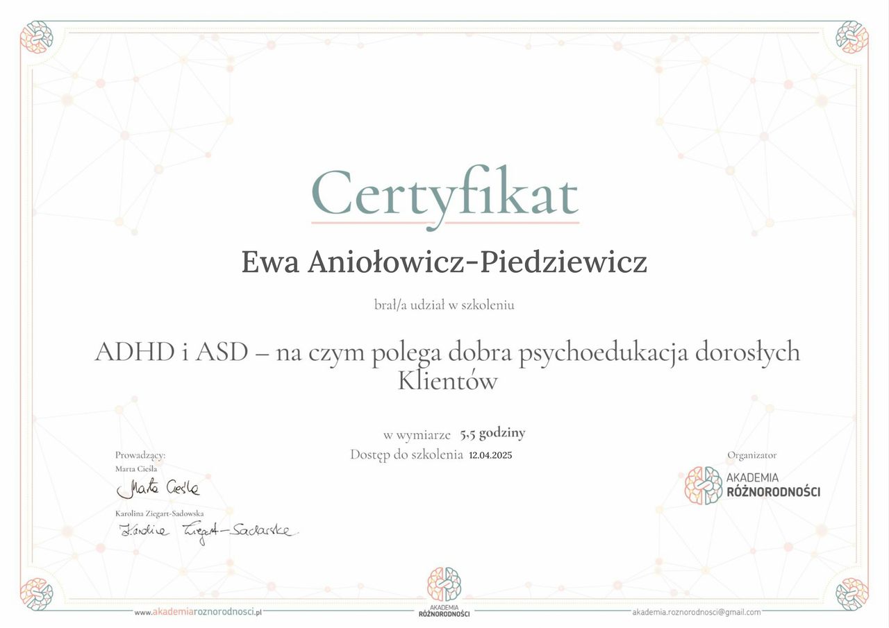 Czy Ewa Aniołowicz-Piedziewicz przyjmuje online, bez konieczności pojawiania się w placówce?Tak, Ewa Aniołowicz-Piedziewicz oferuje konsultacje online. Wybierz opcję „konsultacja online” przy umawianiu wizyty, a zobaczysz dostępne terminy.