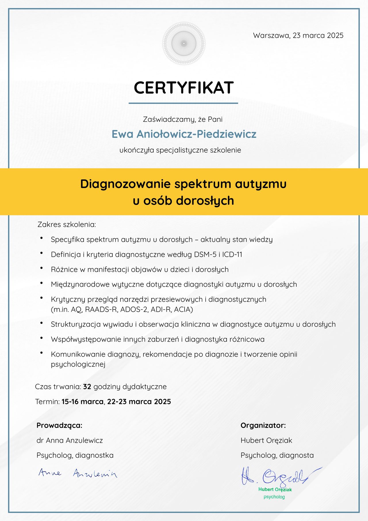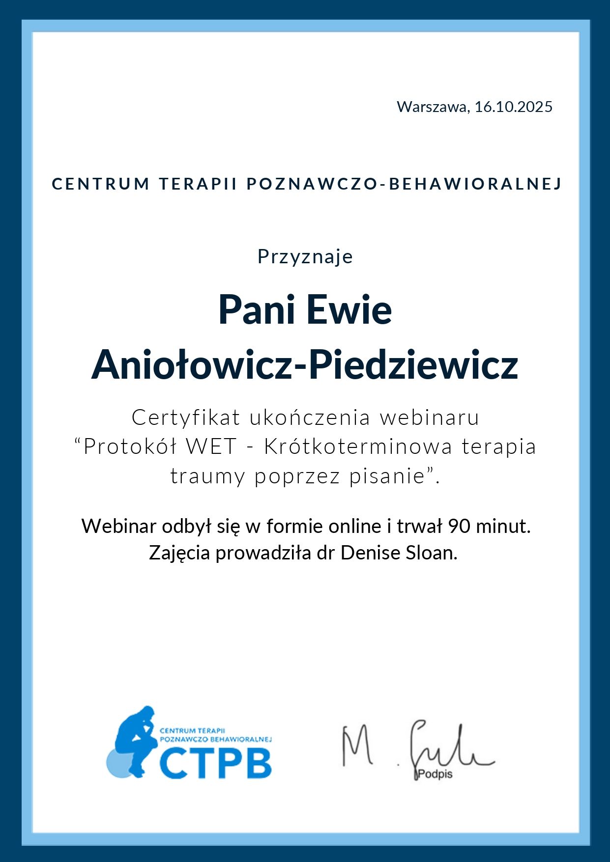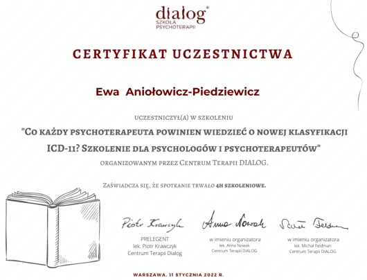 Pani Ewa to niezwykle ciepła, empatyczna i uważna osoba. Od samego początku czułam, że jestem w bezpiecznym miejscu, gdzie mogę mówić otwarcie o swoich trudnościach bez obaw o ocenę. Bardzo cenię sobie jej profesjonalizm i umiejętność trafnego zadawania pytań, które skłaniają do refleksji i pozwalają spojrzeć na problem z innej perspektywy. Zauważyłam realną i dużą zmianę w swoim samopoczuciu i podejściu do siebie i problemów. Dzięki pracy z Panią Ewą odzyskałam nadzieję i poczucie sprawczości. Z całego serca polecam każdemu, kto szuka nie tylko kompetentnej terapeutki, ale też człowieka z prawdziwym zaangażowaniem i sercem do tego, co robi.