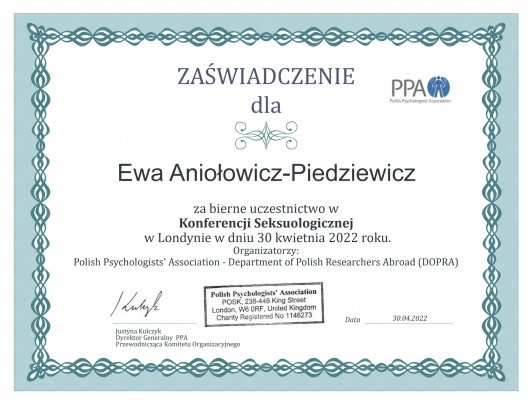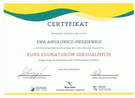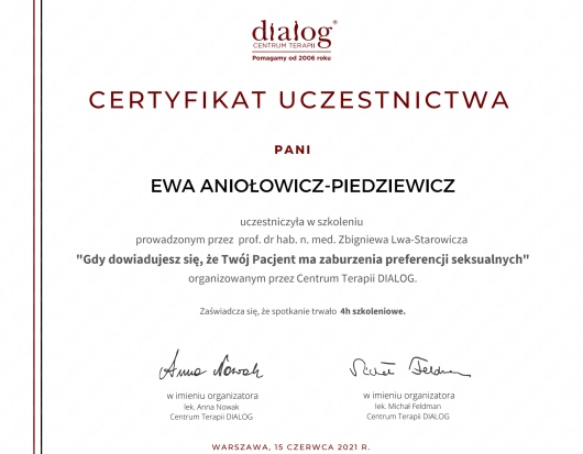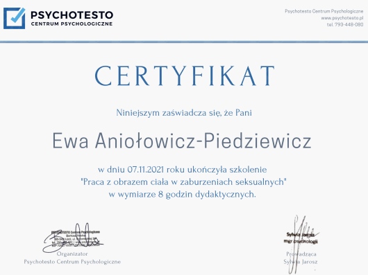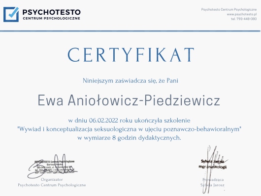 Jaki jest zakres porad oferowanych przez Ewa Aniołowicz-Piedziewicz?Ewa Aniołowicz-Piedziewicz to psycholog, seksuolog. Na podstawie swojego doświadczenia i wykształcenia Ewa Aniołowicz-Piedziewicz oferuje usługi takie jak: konsultacja psychologiczna (kolejna wizyta), konsultacja psychoseksuologa, konsultacja psychologiczna (pierwsza wizyta), Konsultacja telefoniczna - Psycholog kolejna wizyta, Konsultacja telefoniczna - Psycholog pierwszorazowa, Konsultacja Wideo - Psychologa pierwszorazowa, Konsultacja Wideo - Psychologa kolejna wizyta, terapia seksuologiczna dla par, konsultacja psychologiczno-seksuologiczna, Konsultacja Wideo - psycholog-seksuolog pierwszorazowa.
