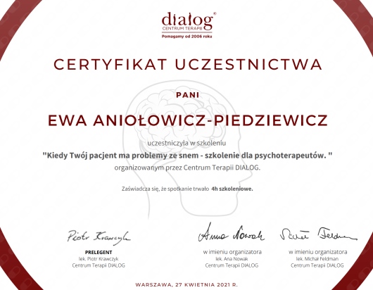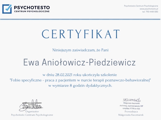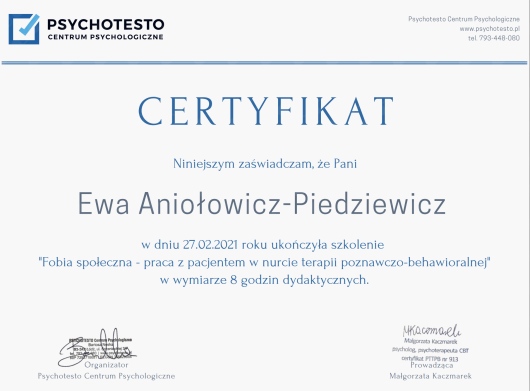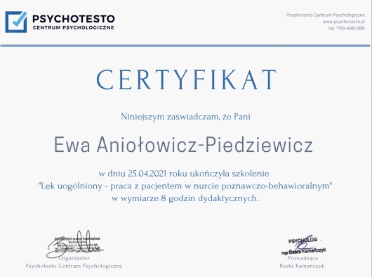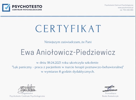 Bardzo dziękuję za tak ciepłą i przemyślaną opinię oraz za zaufanie, jakim mnie Pani obdarzyła! Chciałabym podkreślić, że Pani świadome rozumienie własnych emocji, myśli i zachowań oraz gotowość do pracy nad sobą miały kluczowe znaczenie w procesie zmiany. Życzę Pani dalszego rozwoju – zarówno w życiu osobistym, jak i zawodowym – oraz powodzenia w realizacji wytyczonych przez Panią celów, które omawiałyśmy podczas naszych spotkań.