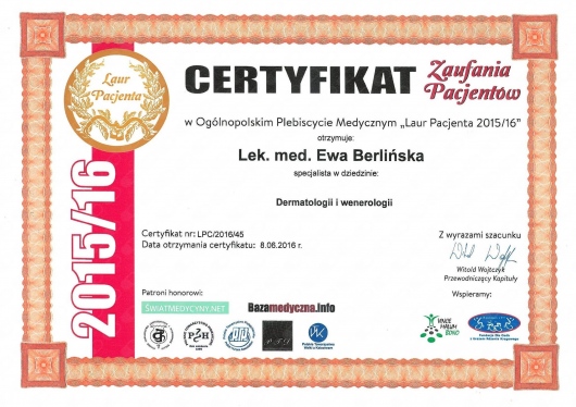 Pani doktor Ewa Berlińska to wspaniały lekarz o ogromnej wiedzy. Miła i sympatyczna. Wyleczyła mnie z uciążliwej choroby skóry. Zaleciła badania,wymazy,leki i zabiegi,które okazały się skuteczne. Z poczucia ogromnej wdzięczności i z szacunku do Pani doktor stwierdzam: Najlepszy dermatolog.