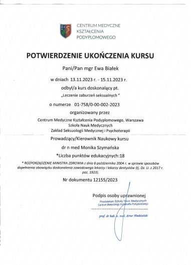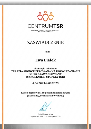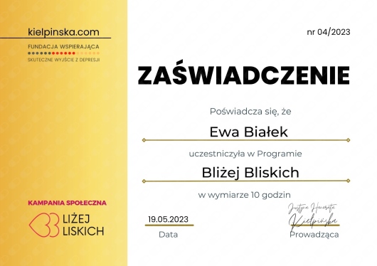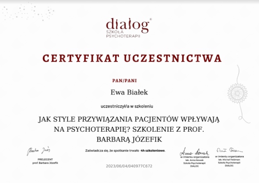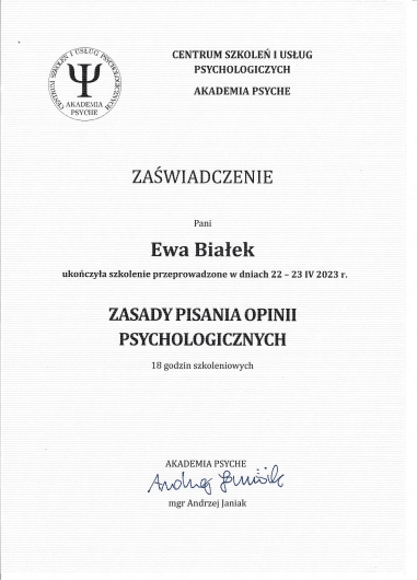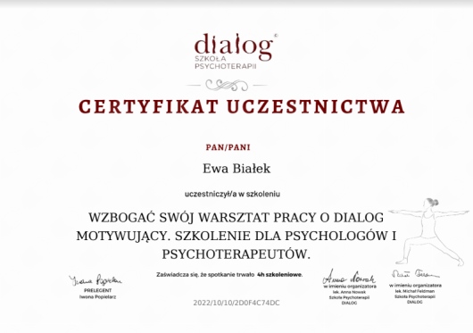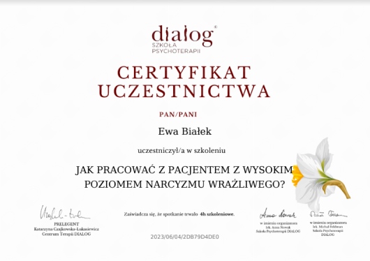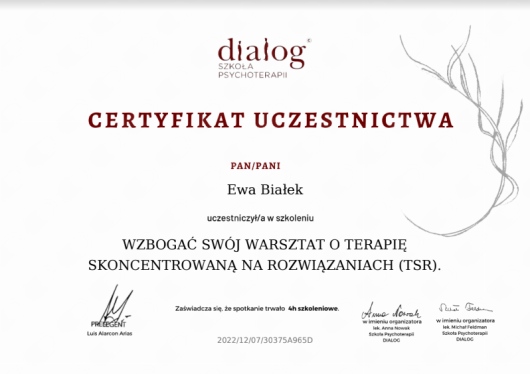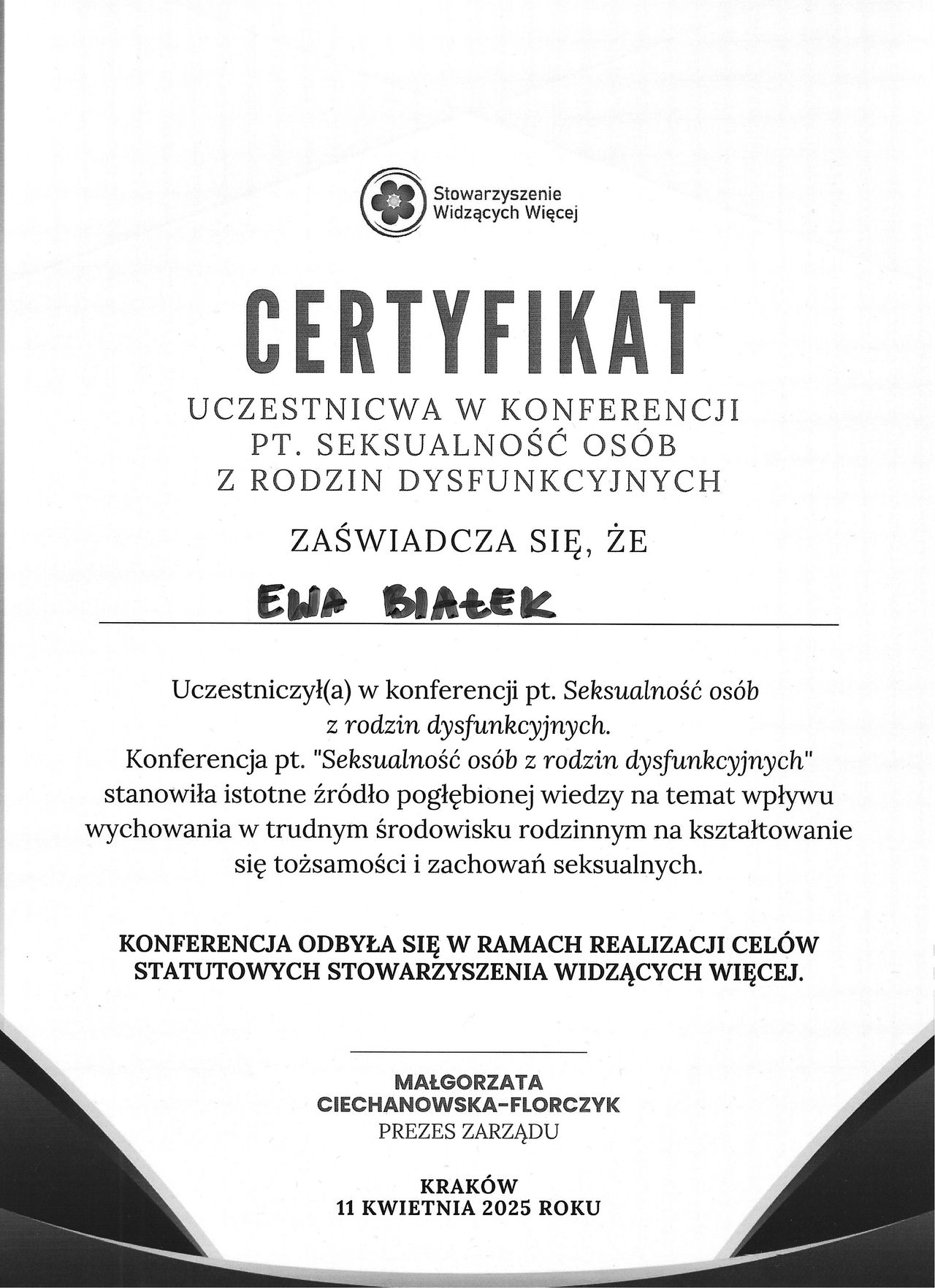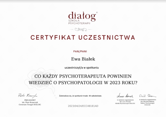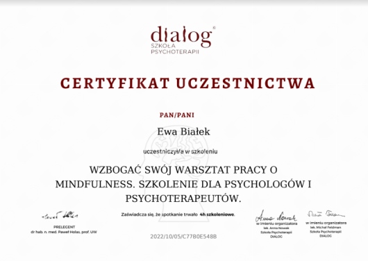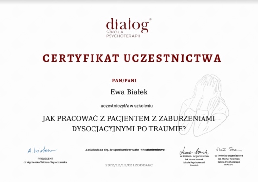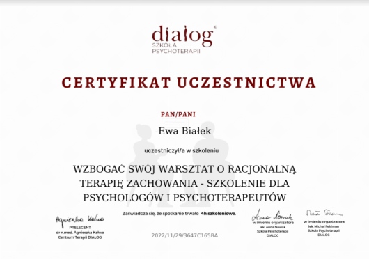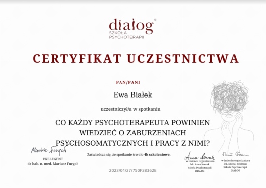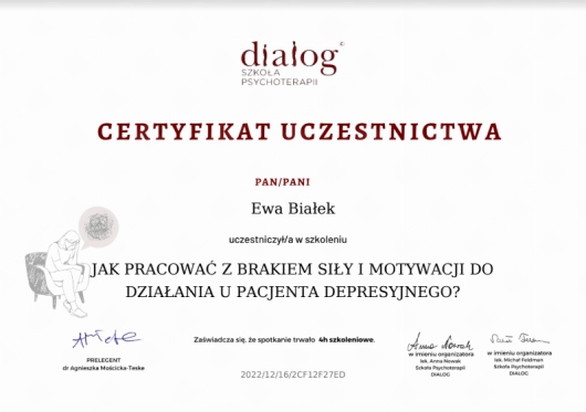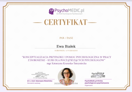 Jestem psychologiem oraz psychoterapeutką w trakcie całościowego szkolenia w Krakowskim Centrum Psychodynamicznym, przygotowującego do uzyskania certyfikatu Polskiego Towarzystwa Psychologicznego. Ukończyłam 5-letnie jednolite studia psychologiczne o specjalności Psychologia kliniczno-sądowa na Wydziale Psychologii, Pedagogiki i Nauk Humanistycznych Krakowskiej Akademii im. Andrzeja Frycza Modrzewskiego oraz I i II stopień szkolenia TSR organizowanego przez Centrum Terapii Skoncentrowanej na Rozwiązaniach. Należę również do Polskiego Stowarzyszenia Terapeutów Terapii Skoncentrowanej na Rozwiązaniach. Ukończyłam także kurs realizowany przez Krajowy Instytut Medyczny uzyskując tytuł Terapeuty Zajęciowego.