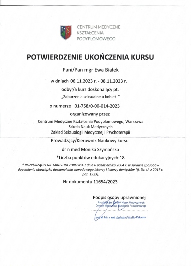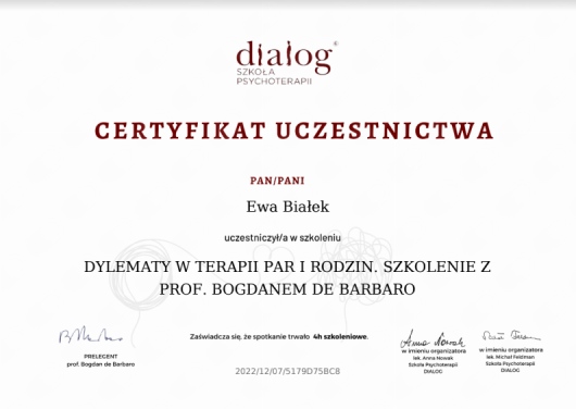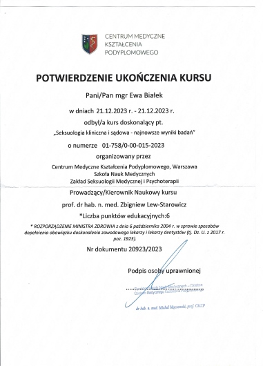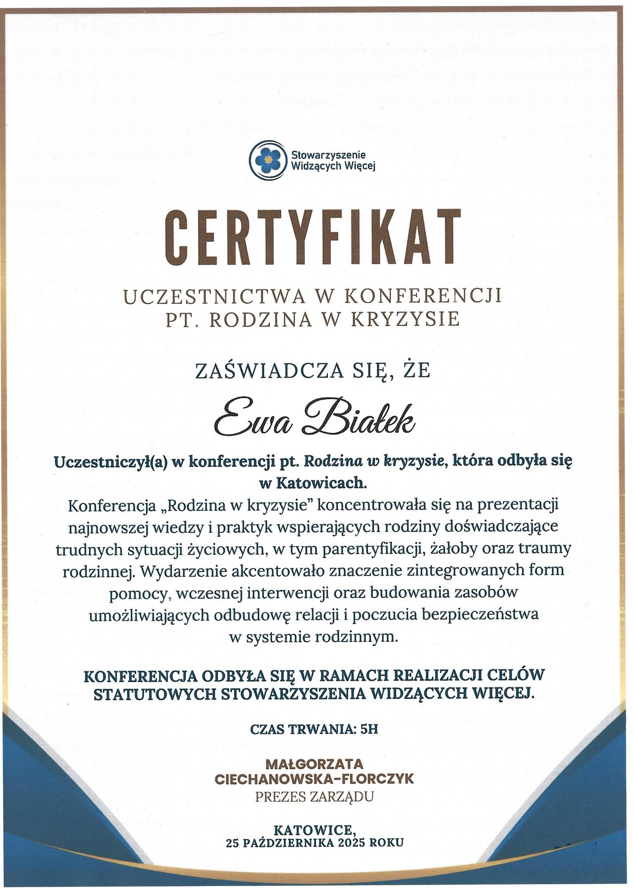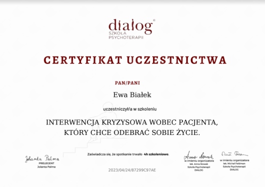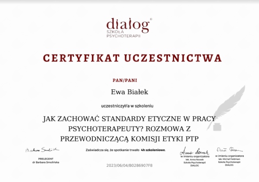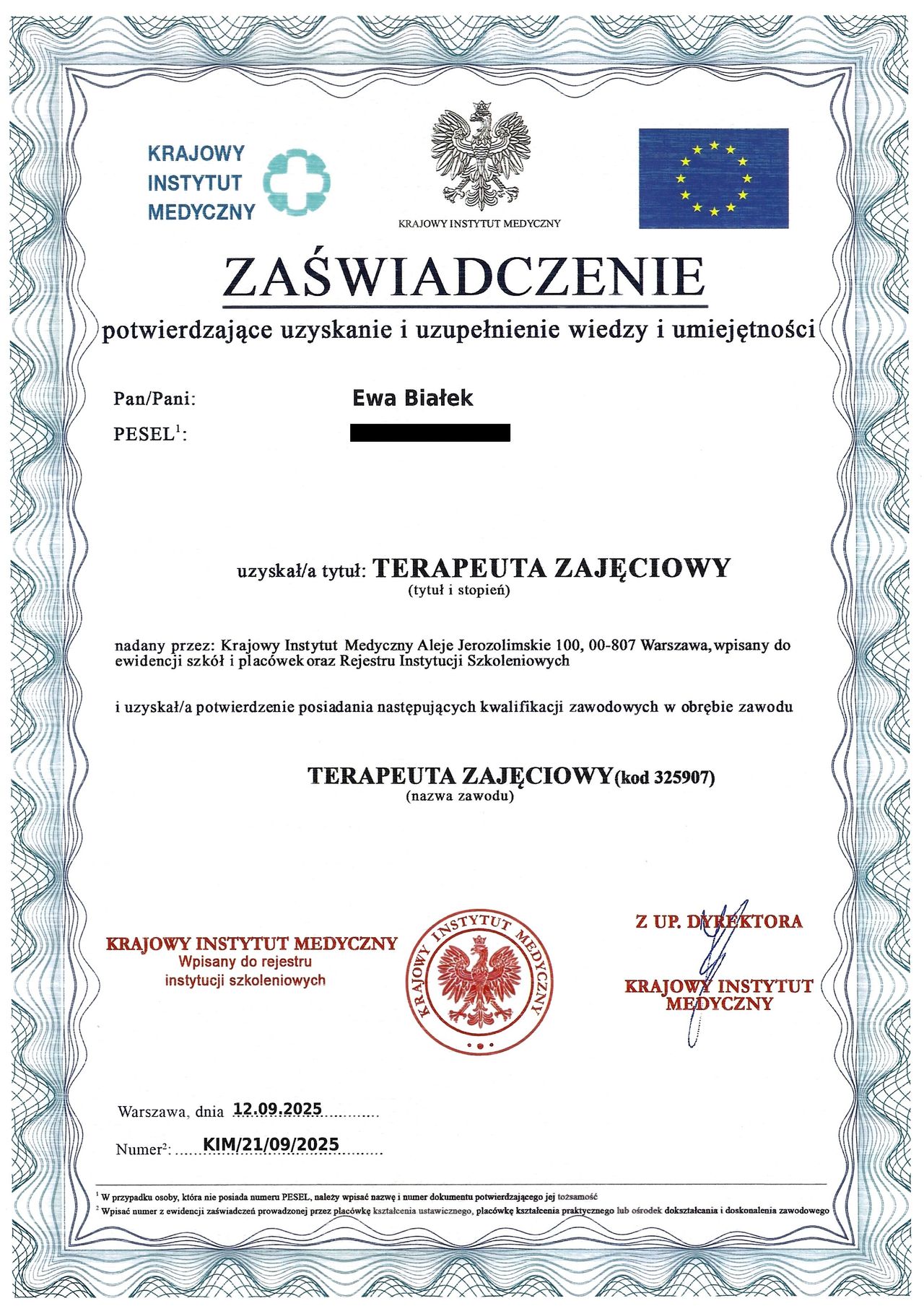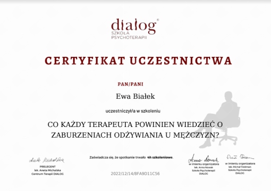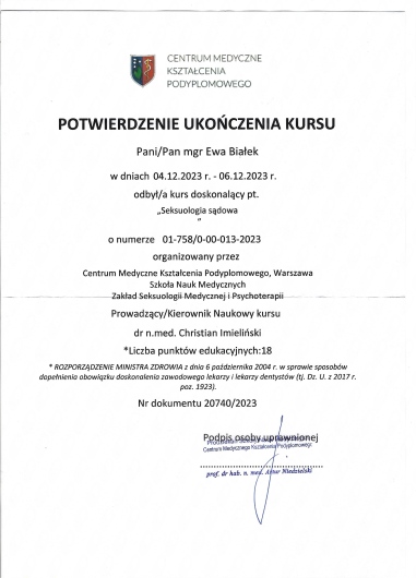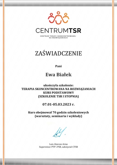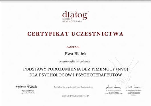 Jestem psychologiem oraz psychoterapeutką w trakcie całościowego szkolenia w Krakowskim Centrum Psychodynamicznym, przygotowującego do uzyskania certyfikatu Polskiego Towarzystwa Psychologicznego. Ukończyłam 5-letnie jednolite studia psychologiczne o specjalności Psychologia kliniczno-sądowa na Wydziale Psychologii, Pedagogiki i Nauk Humanistycznych Krakowskiej Akademii im. Andrzeja Frycza Modrzewskiego oraz I i II stopień szkolenia TSR organizowanego przez Centrum Terapii Skoncentrowanej na Rozwiązaniach. Należę również do Polskiego Stowarzyszenia Terapeutów Terapii Skoncentrowanej na Rozwiązaniach. Ukończyłam także kurs realizowany przez Krajowy Instytut Medyczny uzyskując tytuł Terapeuty Zajęciowego.