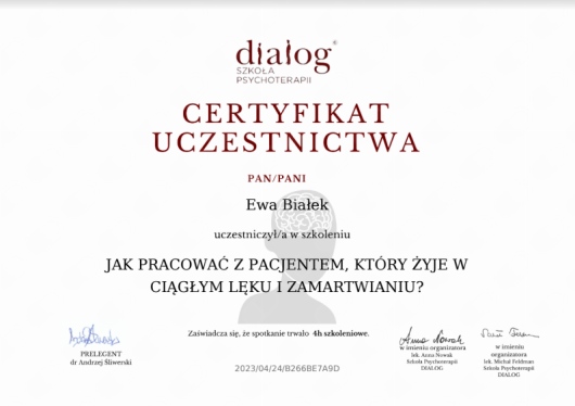Czy Ewa Białek przyjmuje online, bez konieczności pojawiania się w placówce?Tak, Ewa Białek oferuje konsultacje online. Wybierz opcję „konsultacja online” przy umawianiu wizyty, a zobaczysz dostępne terminy.